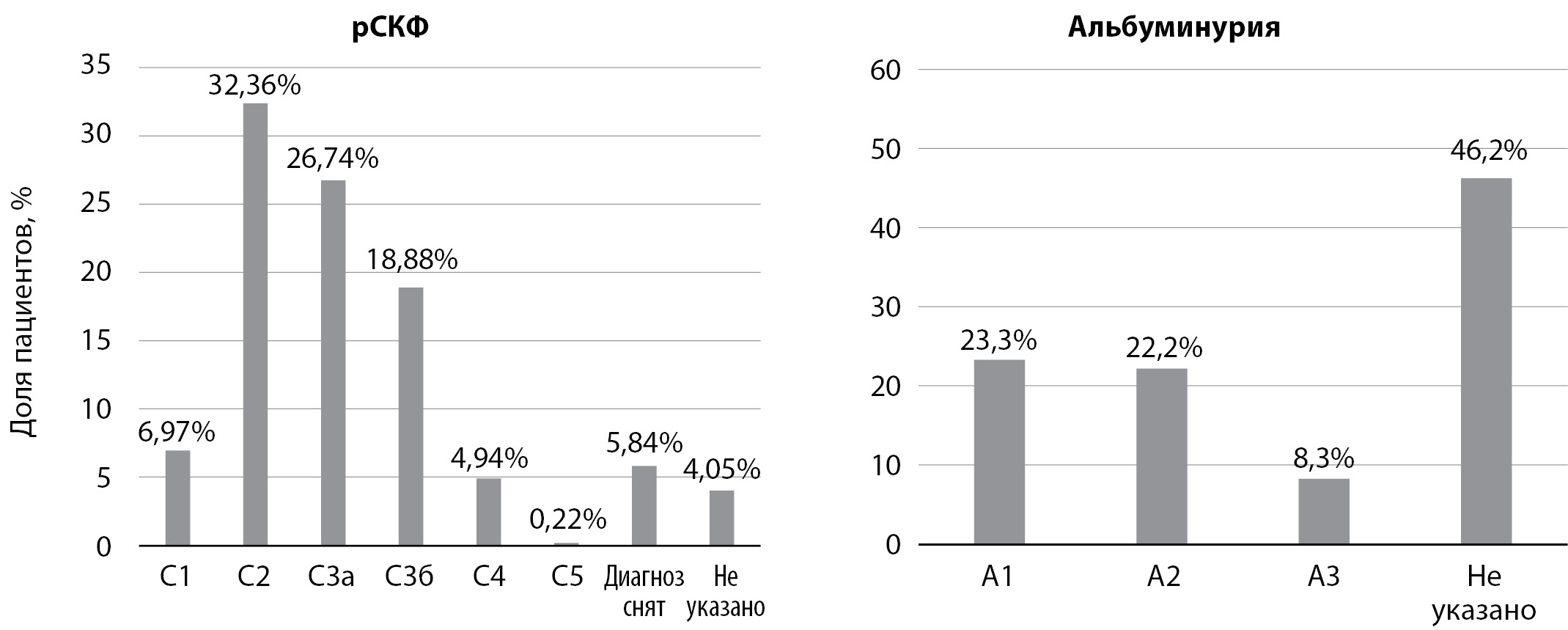 С целью постановки диагноза ХБП всем госпитализированным пациентам проводилась клиническая диагностика, направленная на выявление признаков поражения почек, с учетом жалоб, данных анамнеза, физического, лабораторных и инструментальных исследований на основе следующих критериев: снижения рСКФ<60 мл/мин/1,73 м², сохраняющееся в течение трех и более месяцев, повышение уровня А/Кр, наличие признаков необратимых структурных изменений органа, выявленных однократно при его визуализации. Уровень рСКФ рассчитывался по формуле CKD-EPI [1].
