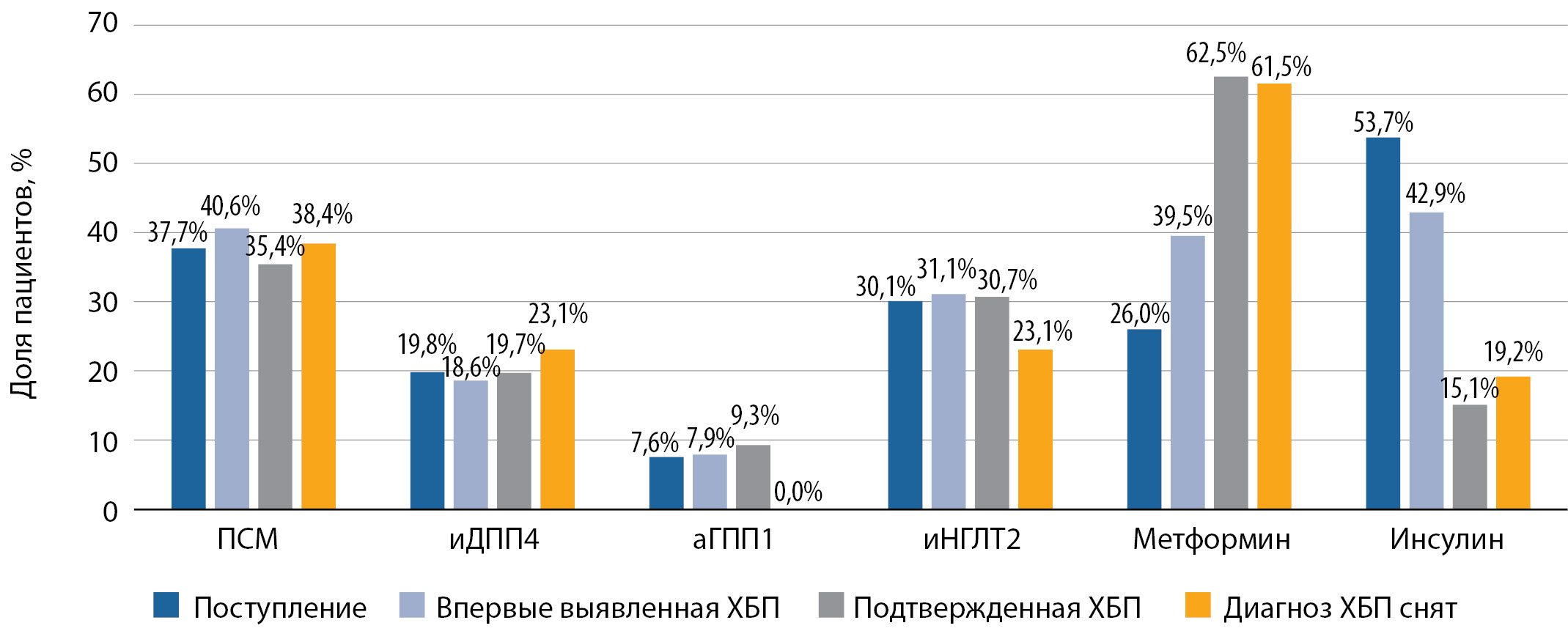 6. Рисунок 6. Частота сахароснижающей терапии у пациентов с сахарным диабетом 2 типа при поступлении и в зависимости от наличия/отсутствия хронической болезни почек.