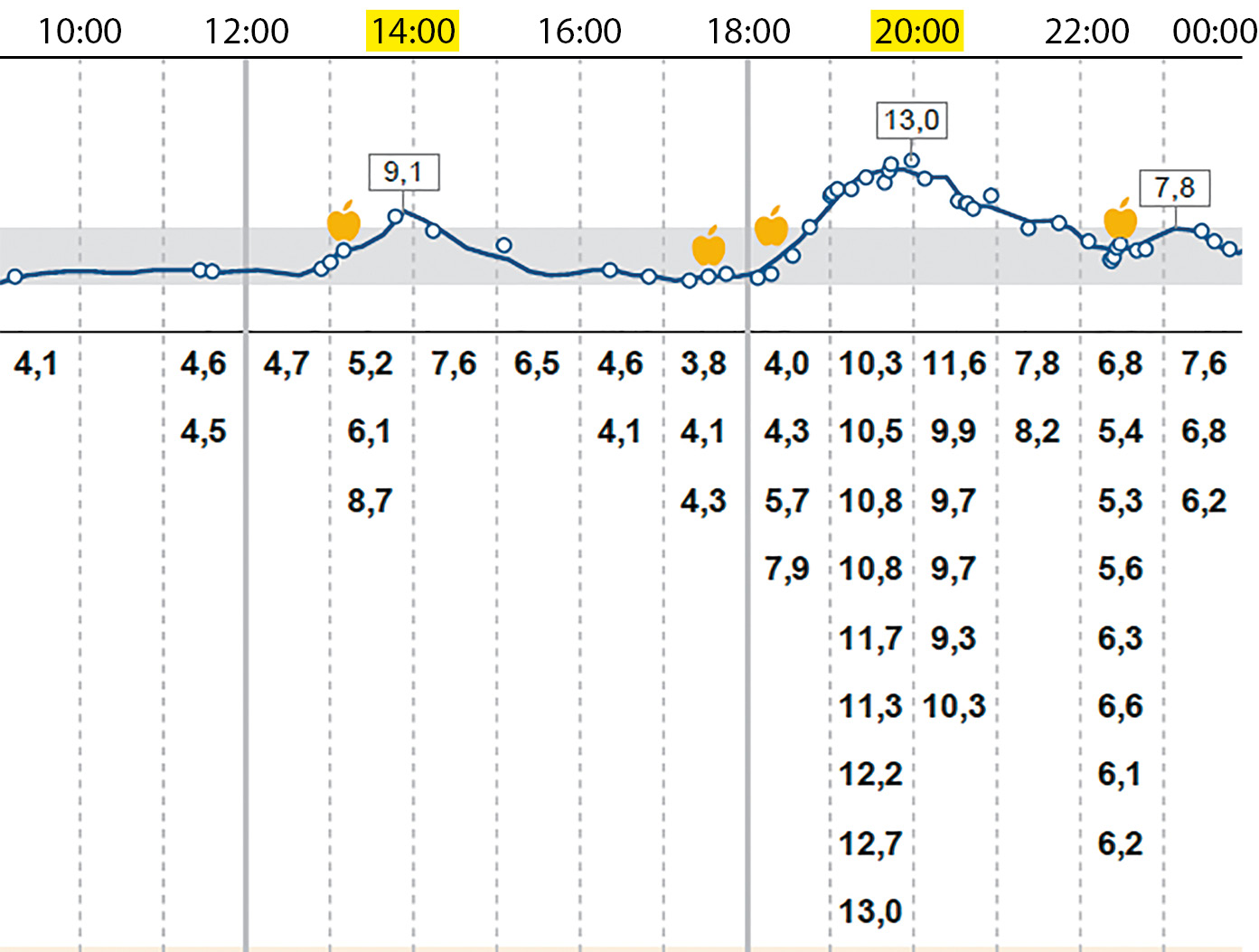 2. Рисунок 1б. Flash-мониторинг FreeStyle Libre1 через три дня после завершения профилактики респираторного дистресс-синдрома новорожденного. Показатели глюкозы находятся в целевом диапазоне.