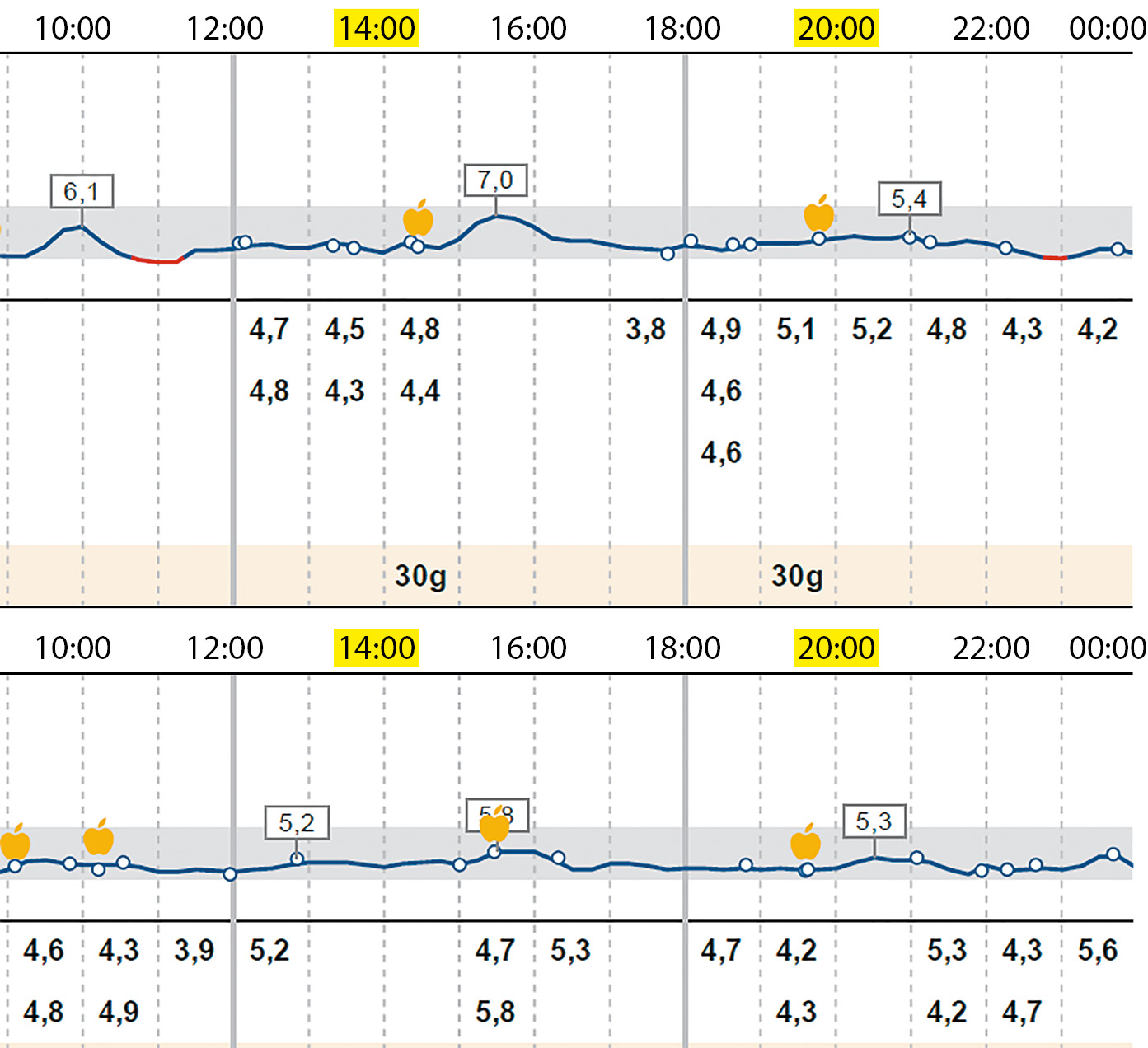 Во втором триместре наблюдалось низкое АД (до 80/55 мм рт.ст.) и гестационное снижение уровня креатинина до 70–72 мкмоль/л с последующим умеренным постепенным нарастанием до 100–107 мкмоль/л к сроку 33 недели. В 29 недель при УЗИ обнаружена умеренная пиелокаликоэктазия трансплантированной почки, допплерометрические показатели почечного кровотока не изменены. По данным акушерского УЗИ: малый для гестационного срока плод. Эхографических признаков диабетической фетопатии и гемодинамических нарушений не выявлено. В 30 недель глюкоза венозной плазмы натощак — 4,2 ммоль/л, гликированный гемоглобин — 5,2%. Однако в сроке 30–31 неделя беременности появились клинические симптомы гипогликемии (без инсулинотерапии), а именно жар, чувство голода, тахикардия, небольшой тремор пальцев кистей, чаще в ночное время, подтвержденные данными самоконтроля гликемии по портативному глюкометру (3,7 ммоль/л). Дополнительно начато проведение Flash-мониторинга FreeStyle Libre1. По данным отчета AGP выявлено, что 21% времени беременная находится ниже целевого диапазона (<3,9 ммоль/л 5 часов 20 минут), а 2% времени — на уровне со значениями глюкозы <3,0 ммоль/л 28 минут. На фоне эпизодов гипогликемии появились эпизоды повышения АД до 135–138/82–87 мм рт.ст. при нормальных значениях в остальное время. Беременной было рекомендовано дополнительно принимать во вторую половину дня и перед сном 36–48 г углеводов со средним гликемическим индексом в сочетании с животными жирами и белками, что полностью купировало симптомы ночной гипогликемии и уменьшило частоту дневных.