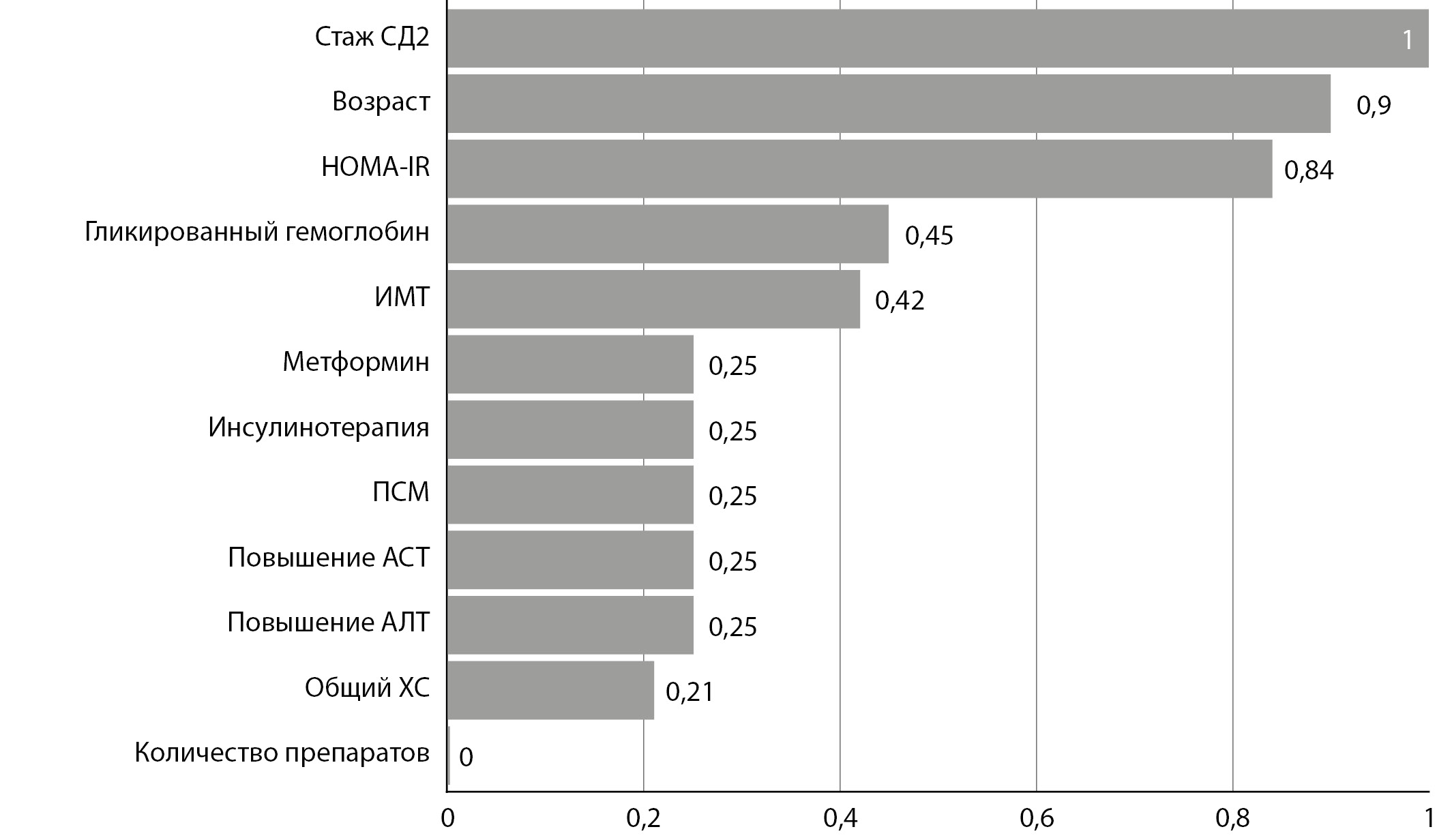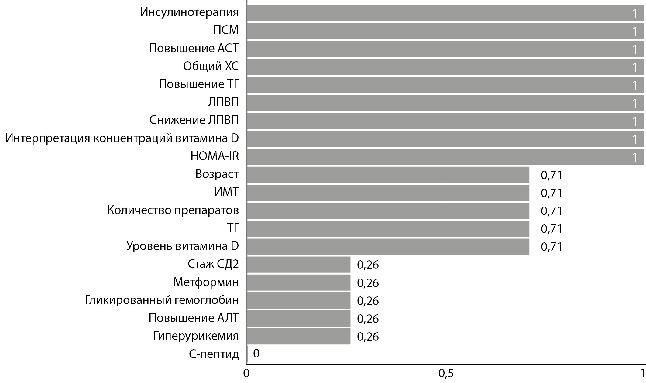Для вычисления относительной важности использовалась кросс-валидация с последовательным удалением одного из полей. В качестве метрики, на основе которой строилась относительная важность, была выбрана ошибка кросс-валидации (доля неправильно классифицированных записей при анализируемом разбиении). В результате в качестве основных факторов выделены: инсулинотерапия, терапия ПСМ, повышение АСТ, общий ХС, повышение ТГ, ЛПВП, снижение ЛПВП, уровень витамина D, HOMA-IR (рис. 1).