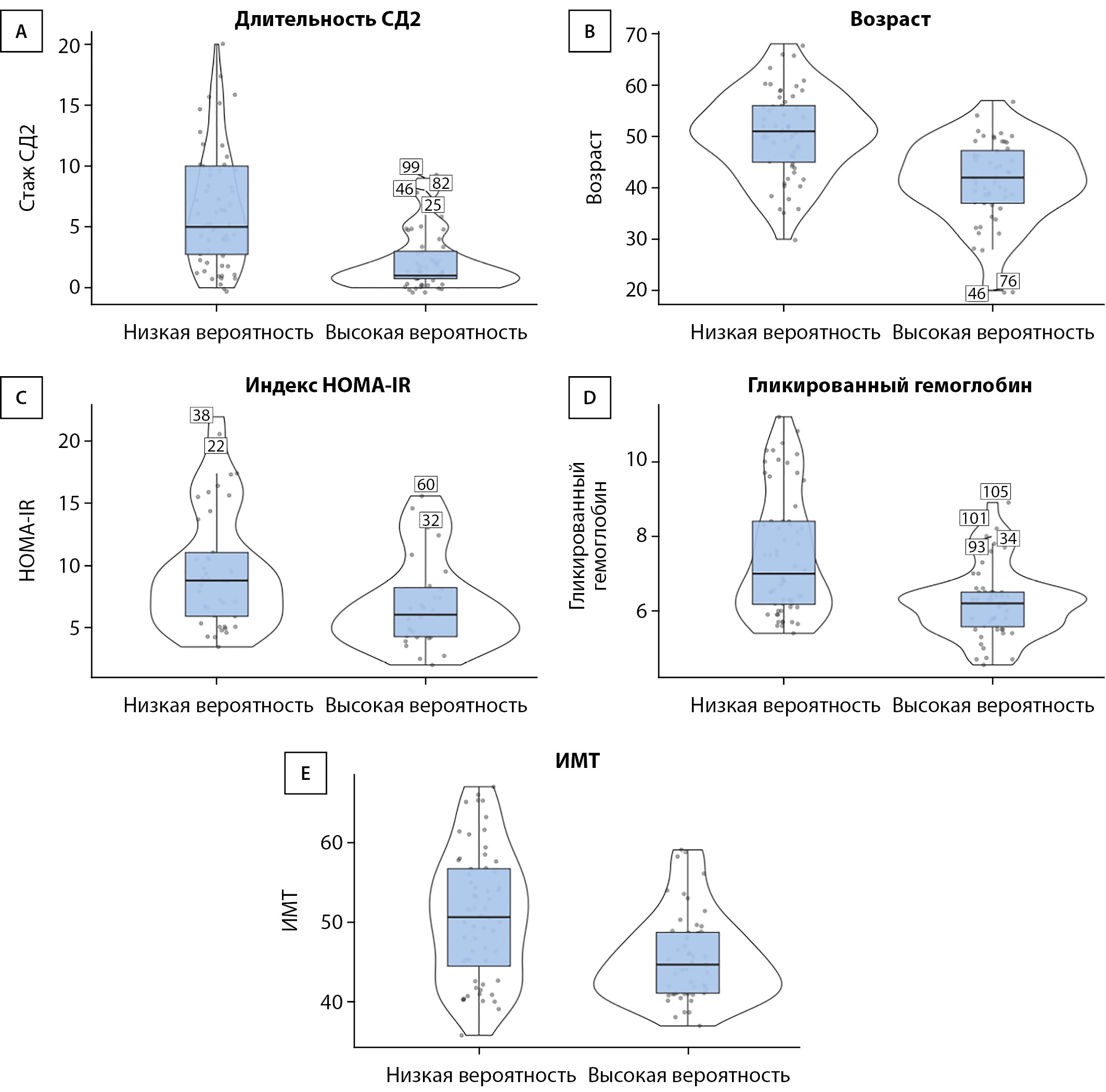 Следующим этапом исследования стало проведение математического анализа дооперационных клинических критериев, ассоциированных с течением ожирения и СД, для поиска независимых предикторов ремиссии СД2: возраст, ИМТ, длительности СД2, количество сахароснижающих препаратов, терапия препаратами бигуанидов, терапия препаратами сульфонилмочевины (ПСМ), инсулинотерапия, предоперационный уровень HbA1с, уровень С-пептида, индекс инсулинорезистентности HOMA-IR, повышение уровня печеночных трансаминаз (отдельно рассматривалось повышение уровня аспартатаминотрансферазы (АСТ) и повышение уровня аланинаминотрансферазы (АЛТ)), гиперурикемия, уровень общего холестерина (ХС), триглицеридов (ТГ), липопротеинов высокой плотности (ЛПВП), уровень витамина D.