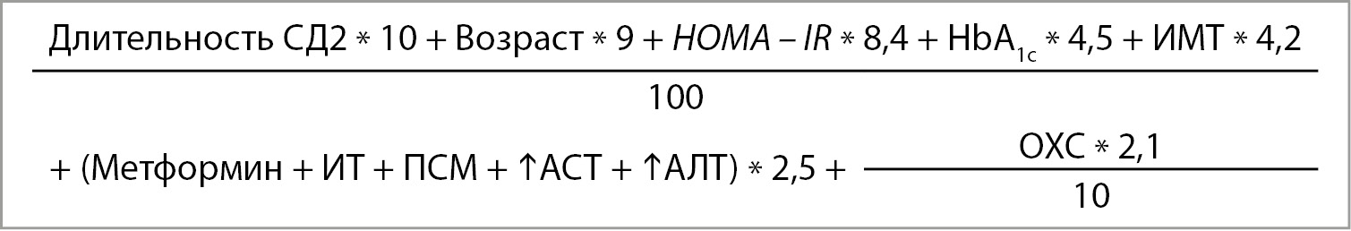 Примечание. ПСМ — производные (препараты) сульфонилмочевины, АСТ — аспартатаминотрансфераза, АЛТ — аланинаминотрансфераза, ХС — холестерин, ИМТ — индекс массы тела, СД2 — сахарный диабет 2 типа, HOMA-IR — Homeostasis model assessment of insulin resistance (индекс инсулинорезистентности HOMA-IR).