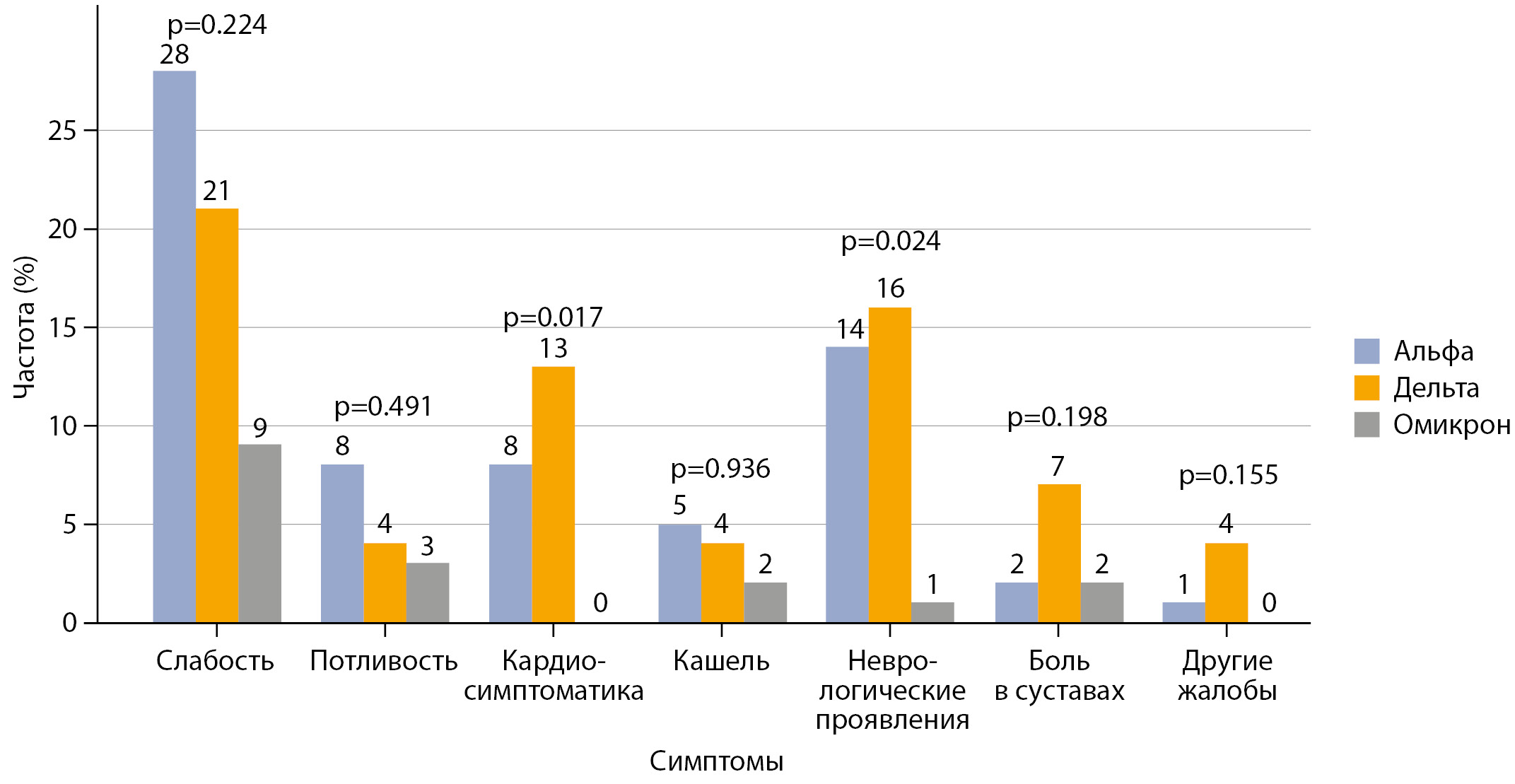 При оценке впервые выявленной симптоматики через 3 месяца после перенесенного COVID-19 было отмечено большее количество кардиологических и неврологических жалоб у пациентов «Альфа» и «Дельта» временных периодов по сравнению с периодом «Омикрон», что в целом соответствует большей заболеваемости пациентов первых двух групп. Ранее в систематическом обзоре Moussaoui El и соавт. отмечалось, что постковидный синдром может включать до 50 симптомов, самыми распространенными из которых являются усталость (58%), головная боль (44%), нарушение внимания (27%), выпадение волос (25%) и одышка (24%) [30]. С учетом того, что чаще выявлялась кардиосимптоматика, по данным обзора коморбидных патологий при COVID-19 Silaghi-Dumitrescu R и соавт. [31], сердечно-сосудистые заболевания (ССЗ) обычно связаны с тяжестью COVID-19. Косвенно манифестация кардиологической симптоматики в группах, связанных с более тяжелыми периодами COVID-19, может говорить о двунаправленности этого утверждения. Данные о распространенности неврологической симптоматики согласуются с доказательствами того, что SARS-CoV-2 оказывает долгосрочное воздействие на неврологическую систему, включая инсульт, энцефалит и другие тяжелые заболевания центральной нервной системы [32–34].