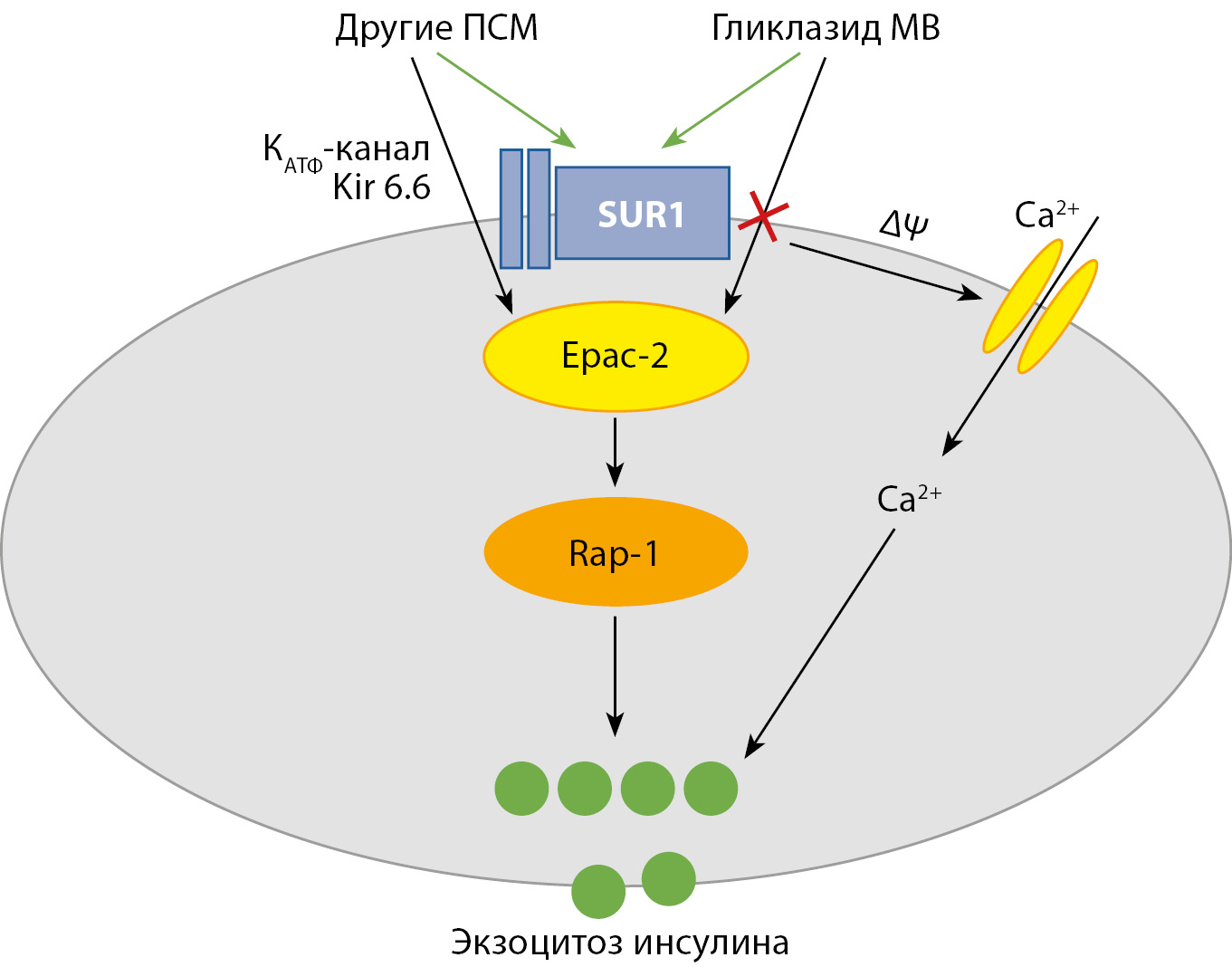 Для группы ПСМ характерны значимые внутриклассовые различия, прежде всего обусловленные принципиальным отличием молекулы гликлазида, характеризующейся отсутствием бензамидного фрагмента и наличием аминоазабициклооктильного кольца. В отличие от других ПСМ гликлазид МВ связывается обратимо и только с SUR1 рецептором на β-клетках поджелудочной железы, не влияя на SUR2 рецепторы (в сердце и гладкой мускулатуре), и не оказывает воздействие на инсулиносекрецию через Epac2 путь. Epac2 является обменным белком, активируемым циклическим АМФ, а также непосредственной мишенью 3'-5'-циклического аденозинмонофосфата (цАМФ). Белок, называемый Epac, был идентифицирован в 1998 г. двумя независимыми группами экспертов. Существует две изоформы Epac: Epac1 и Epac2, которые кодируются соответствующими генами: Rapgef3 и Rapgef4 [13].