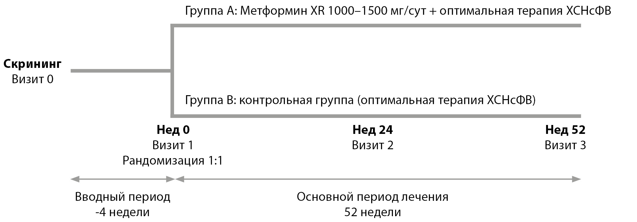 Стартовая доза метформина XR во вводном периоде составляла 750 мг один раз в сутки, в случае переносимости — с ее повышением через 2 недели до 1500 мг в сутки (2 таблетки по 750 мг один раз в сутки) в течение следующих 2 недель вводного периода. В случае непереносимости до рандомизации доза препарата снижалась до 1000 мг в сутки. После рандомизации пациенты, включенные в группу А, получали стандартное лечение ХСНсФВ, согласно Российским клиническим рекомендациям «Хроническая сердечная недостаточность», 2020 г. [12] + метформин XR в дозе 1500 мг в сутки. В случае непереносимости доза препарата снижалась до 1000 мг в сутки. Пациенты группы В получали стандартную терапию ХСНсФВ, согласно Российским клиническим рекомендациям «Хроническая сердечная недостаточность», 2020 г. [12].