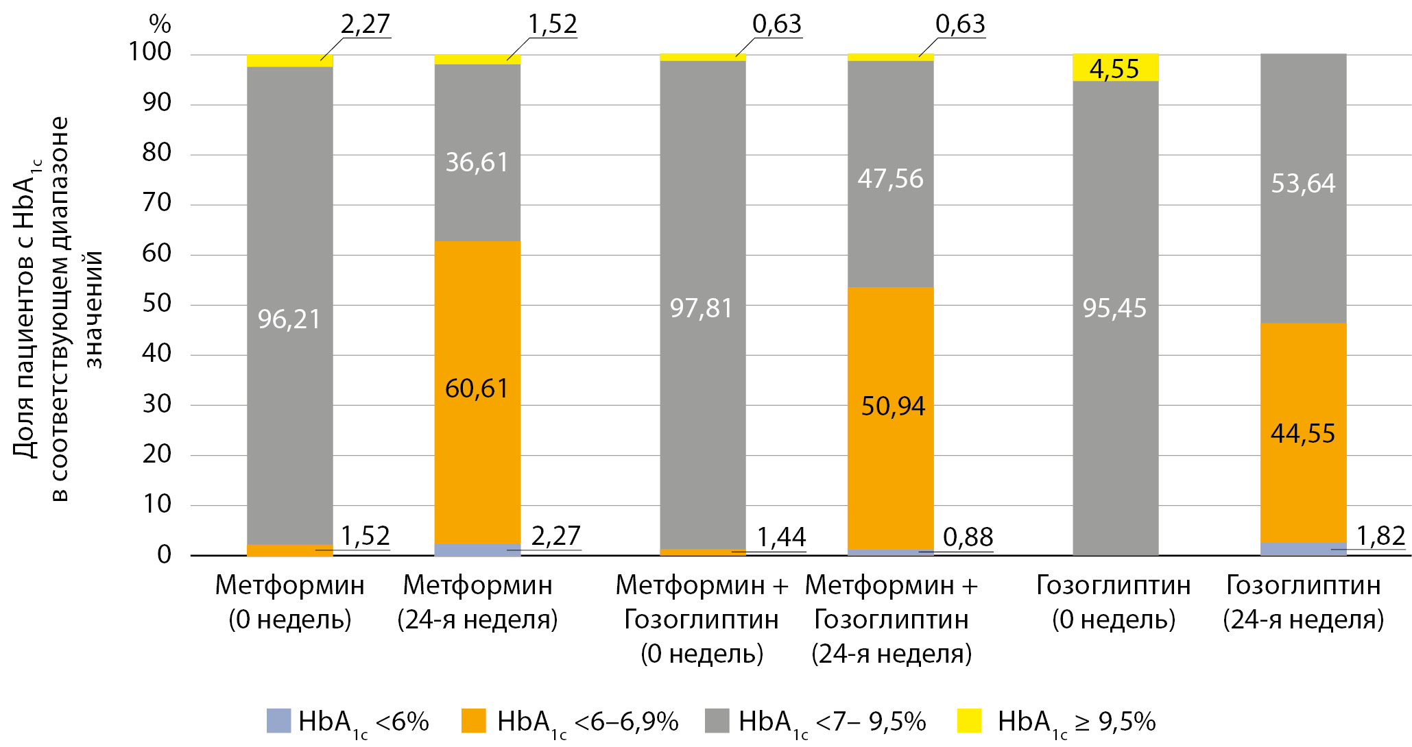 Рисунок 2. Динамика распределения пациентов по диапазонам уровня HbA1c на терапии метформином, гозоглиптином и комбинированной терапии (метформин + гозоглиптин) исходно (0 недель) и через 24 недели лечения.