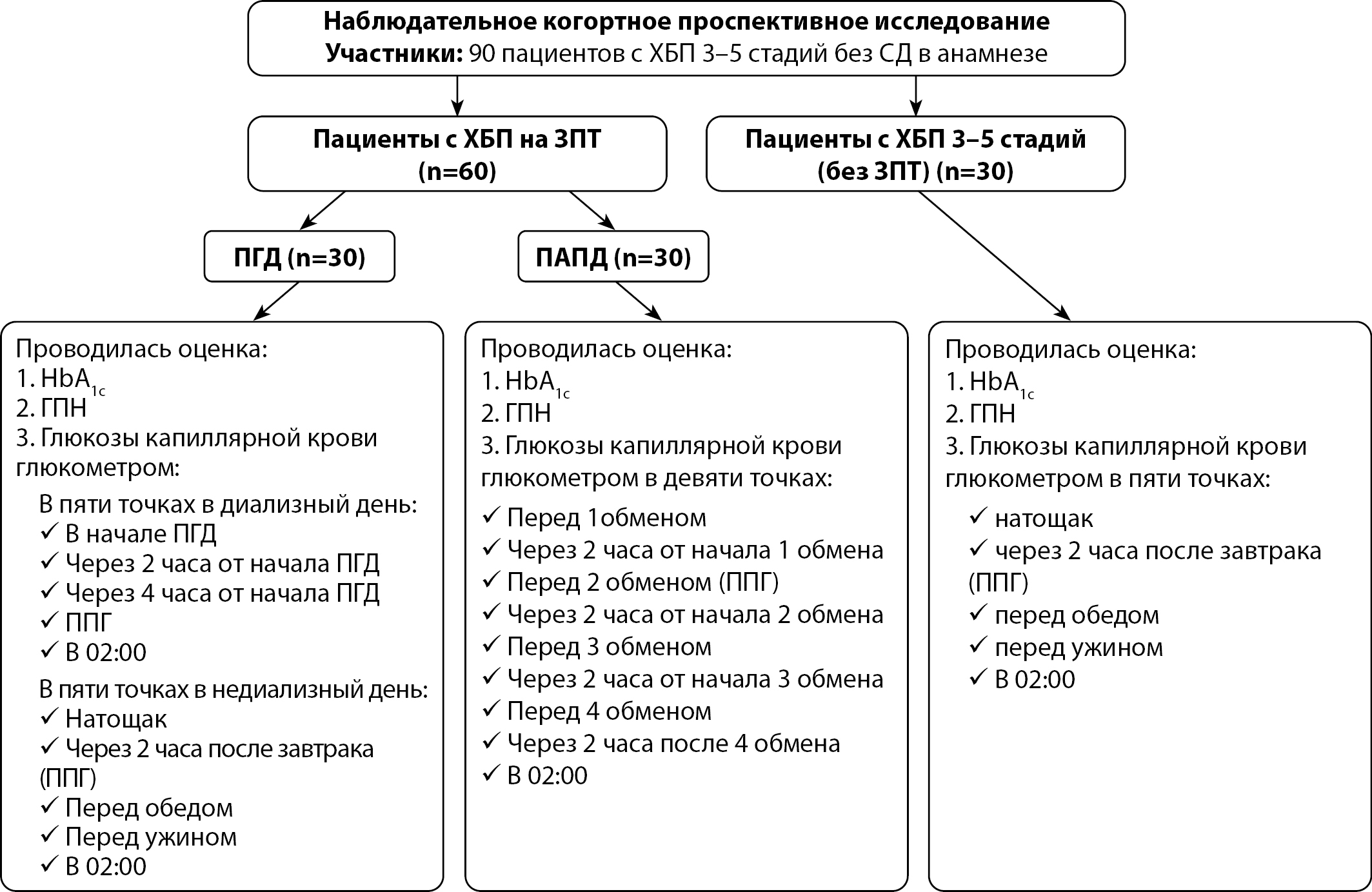 Проведено наблюдательное когортное проспективное исследование 60 пациентов с ХБП на ЗПТ и 30 пациентов с ХБП С3–С5 (без ЗПТ), не имеющих СД в анамнезе, на базе ГБУЗ г. Москвы «ГКБ №52 ДЗМ» с марта 2022-го по февраль 2024 гг. Дизайн исследования представлен на рис. 1.