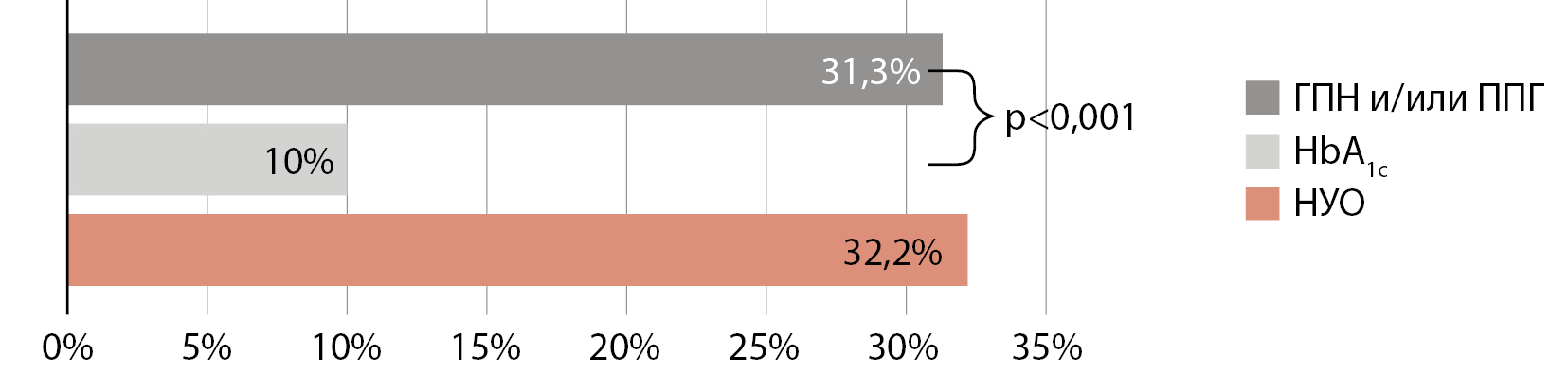 Уровень HbA1c, ГПН определяли стандартизированными методами, ППГ оценивали с помощью глюкометра OneTouch Verio Pro+ после стандартного завтрака, содержащего 65–70 г углеводов. НУО оценивали по уровню HbA1c, ГПН, ППГ. Верифицировали СД и другие нарушения гликемии согласно ВОЗ (1999–2013 гг.): НГН, НТГ, впервые выявленный СД. НГН диагностировали при гликемии натощак ≥6,1<7,0 ммоль/л, НТГ — при ППГ ≥7,8<11,1 ммоль/л, впервые выявленный СД — при наличии двух показателей выше нормы: HbA1c≥6,5% и ГПН≥7,0 ммоль/л или ГПН≥7,0 ммоль/л и ППГ≥11,1 ммоль/л. Пациентов только с ГПН≥7,0 ммоль/л относили в группу НГН. Пациентов только с гипергликемией натощак ≥6,1<7,0 ммоль/л и с постпрандиальной гликемией ≥7,8<11,1 ммоль/л выделили в группу НГН и НТГ. НУО верифицировали при наличии показателей гликемии, соответствующих СД, НГН, НТГ и НГН в сочетании с НТГ.