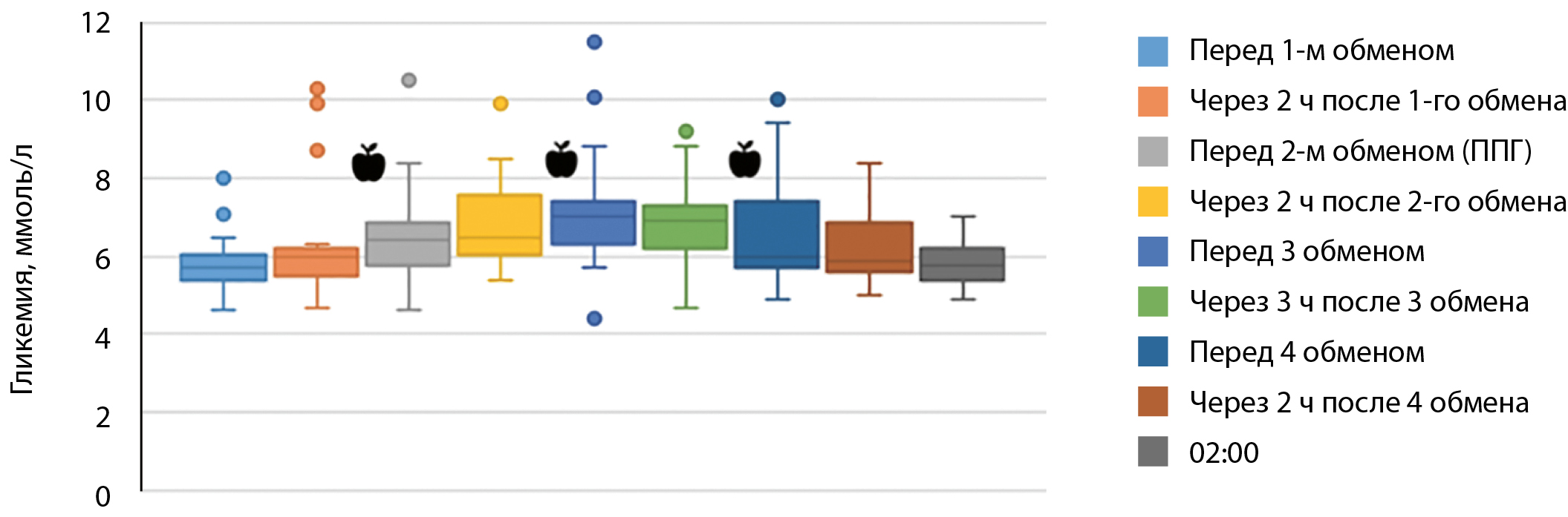 Все пациенты на ПГД получали раствор с содержанием глюкозы 5,5 ммоль/л, на ПАПД — одинаковую схему, наиболее часто используемую для лечения данной группы на ЗПТ: первый и второй обмены — раствор с содержанием глюкозы 2,27%, при проведении третьего и четвертого обменов — раствор с содержанием глюкозы 1,36%. Не использовались гиперосмолярные растворы.