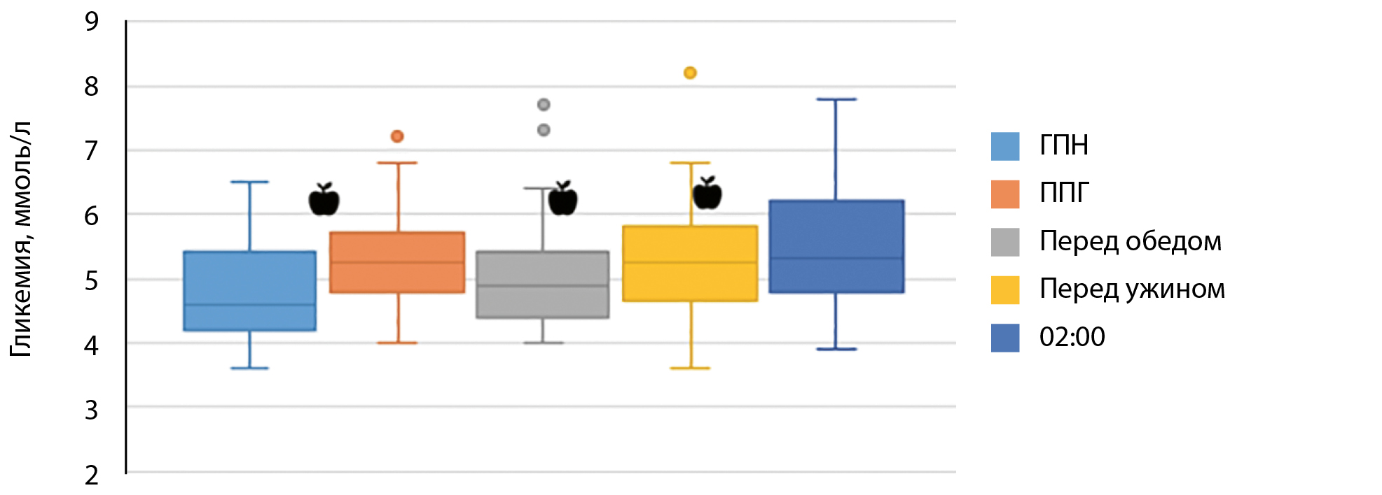 5. Рисунок 5. Вариабельность медианы гликемии у пациентов без сахарного диабета на программном гемодиализе в диализный день, p Friedman=0,001. | |