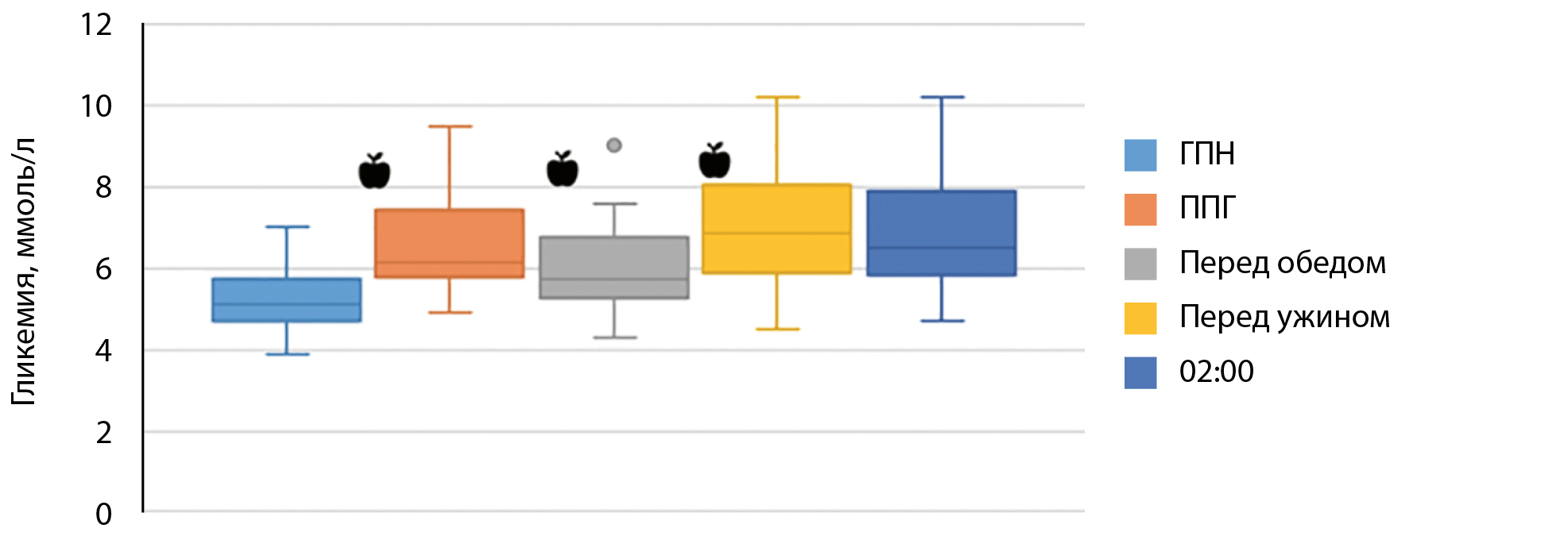 4. Рисунок 4. Вариабельность медианы гликемии у пациентов без сахарного диабета на постоянном амбулаторном перитонеальном диализе, р Friedman <0,001. | |