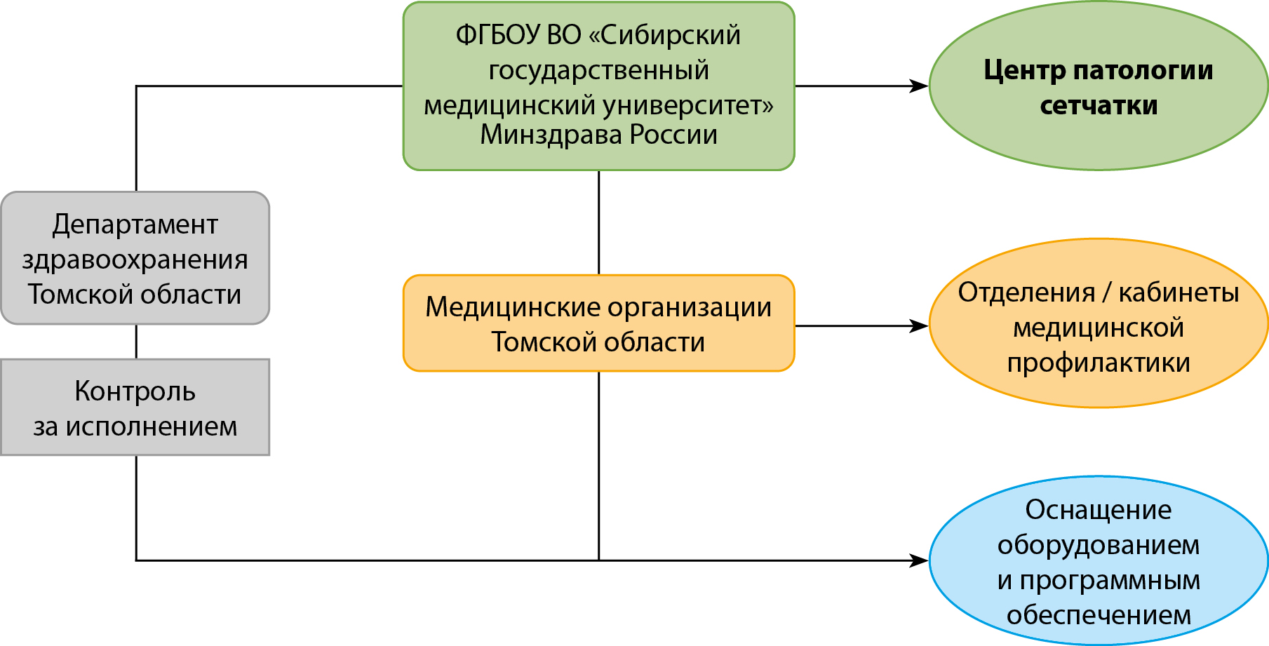 Ключевое условие в организации системы скрининга на ДР — создание Центра патологии сетчатки (ЦПС). Центр организован на основании приказа ректора ФГБОУ ВО СибГМУ МЗ РФ от 30.12.2022 г. №865 в составе офтальмологической клиники СибГМУ на функциональной основе. Основной целью деятельности ЦПС является профилактика слепоты и тяжелых нарушений зрения в субъекте, ассоциированных с патологией сетчатки, путем цифрового скрининга и раннего начала лечения. ЦПС встроен в цифровую модель организации медицинской помощи по профилю «офтальмология» как референс-центр, у которого есть ряд функций, в т.ч. по организации и контролю проведения скрининговых мероприятий. Ключевыми участниками системы являются ФГБОУ ВО «Сибирский государственный медицинский университет» Минздрава России, медицинские организации (МО) Томской области. Контроль за исполнением проекта возложен на Департамент здравоохранения Томской области (рис. 1).