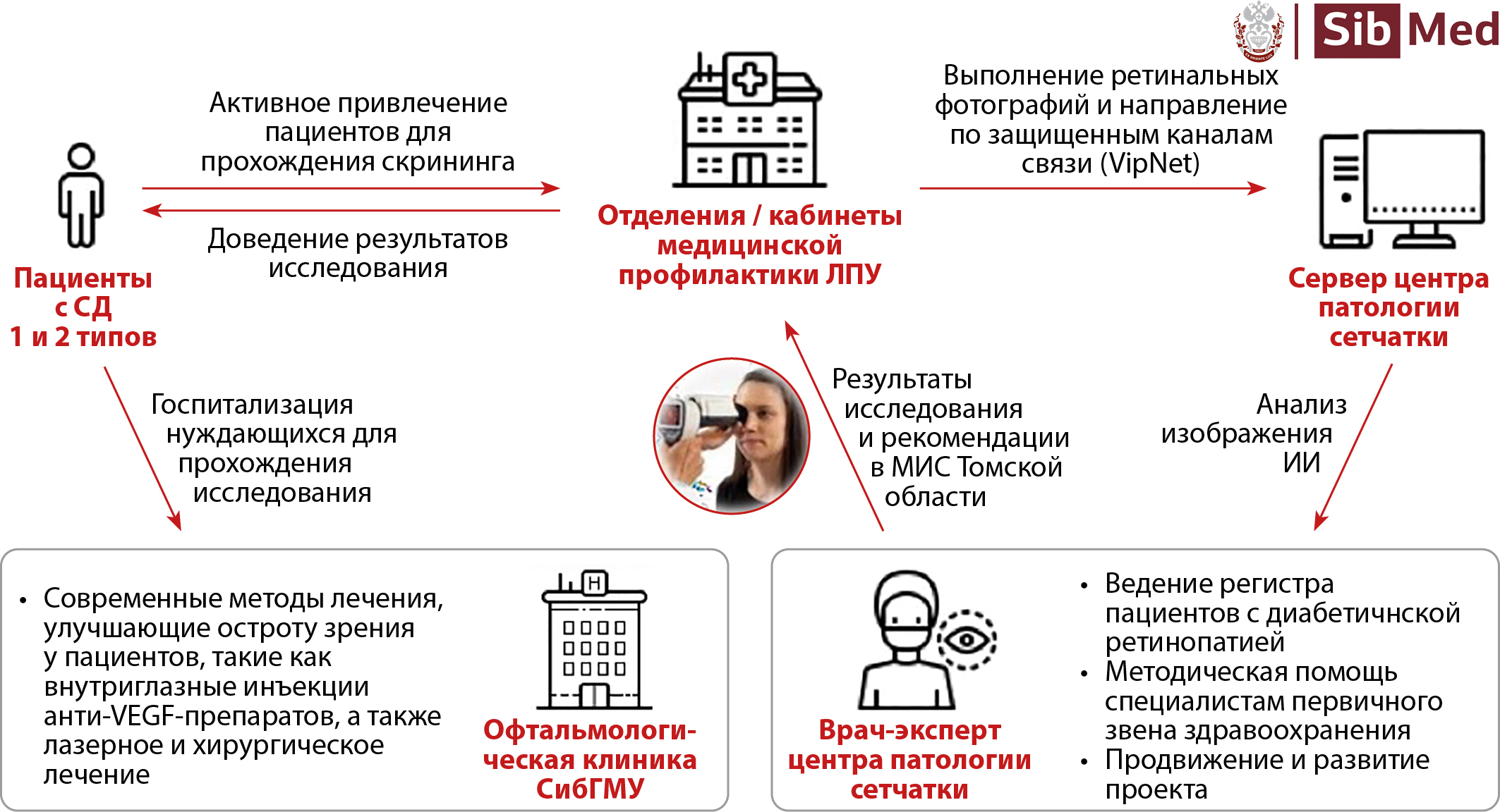 Скрининг на ДР является эффективной мерой предотвращения нарушений зрения, слепоты и инвалидности. Внедрение и адаптация цифровой инфраструктуры в рамках реализуемой новой модели организации медицинской помощи по профилю «офтальмология» у пациентов с ДР направлена на решение стратегических задач системы здравоохранения Томской области по раннему выявлению данной патологии среди пациентов с СД, своевременному началу лечения, снижению инвалидности и слепоты вследствие ДР, уменьшению числа повторных госпитализаций пациентов с осложнениями данного заболевания, снижению дней нетрудоспособности по причине развития поздних стадий.