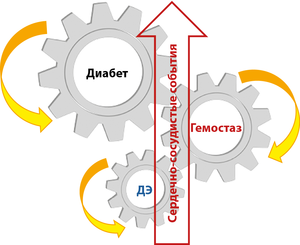1. Рисунок 1. Роль взаимного влияния сахарного диабета, дисбаланса гемостаза и дисфункции эндотелия в увеличении риска развития сердечно-сосудистых заболеваний.