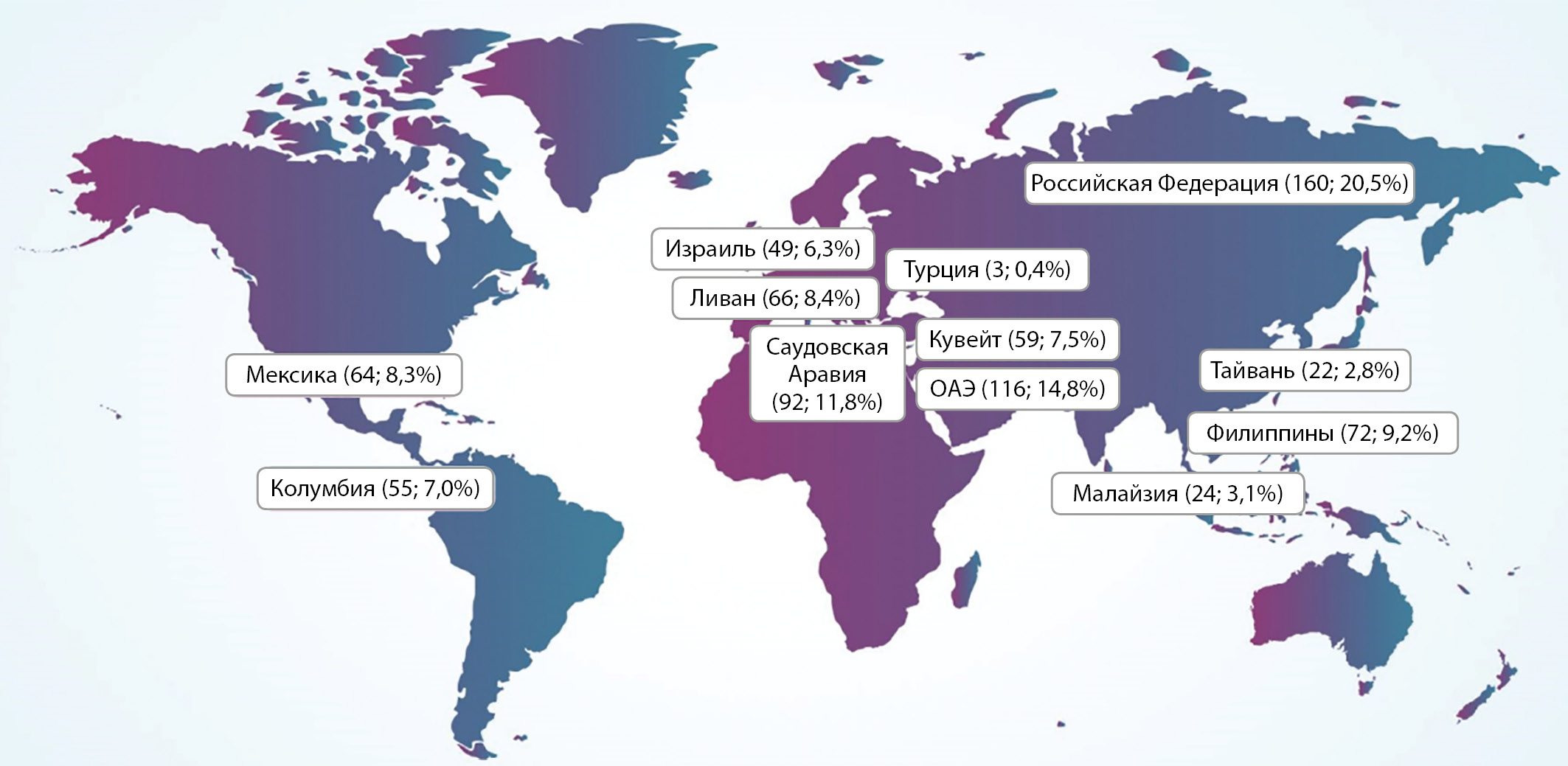 В международное многоцентровое проспективное наблюдательное неинтервенционное 12-месячное исследование SUCCESS [7] было включено 737 взрослых пациентов с СД2. Страны-участники представлены на рис. 1.