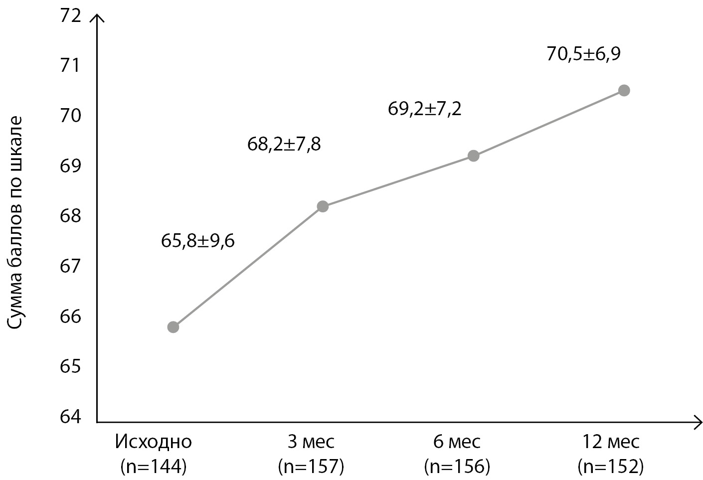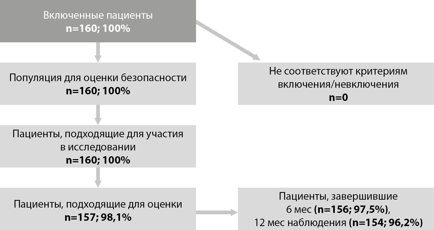 Набор пациентов происходил с октября 2020-го до августа 2021 гг., последний визит — в сентябре 2022 г., длительность наблюдательного периода составила 12 мес.