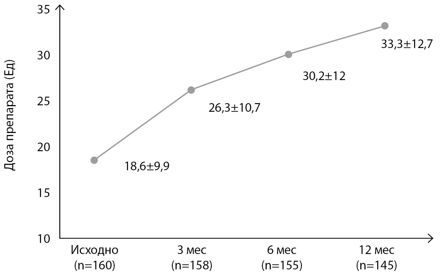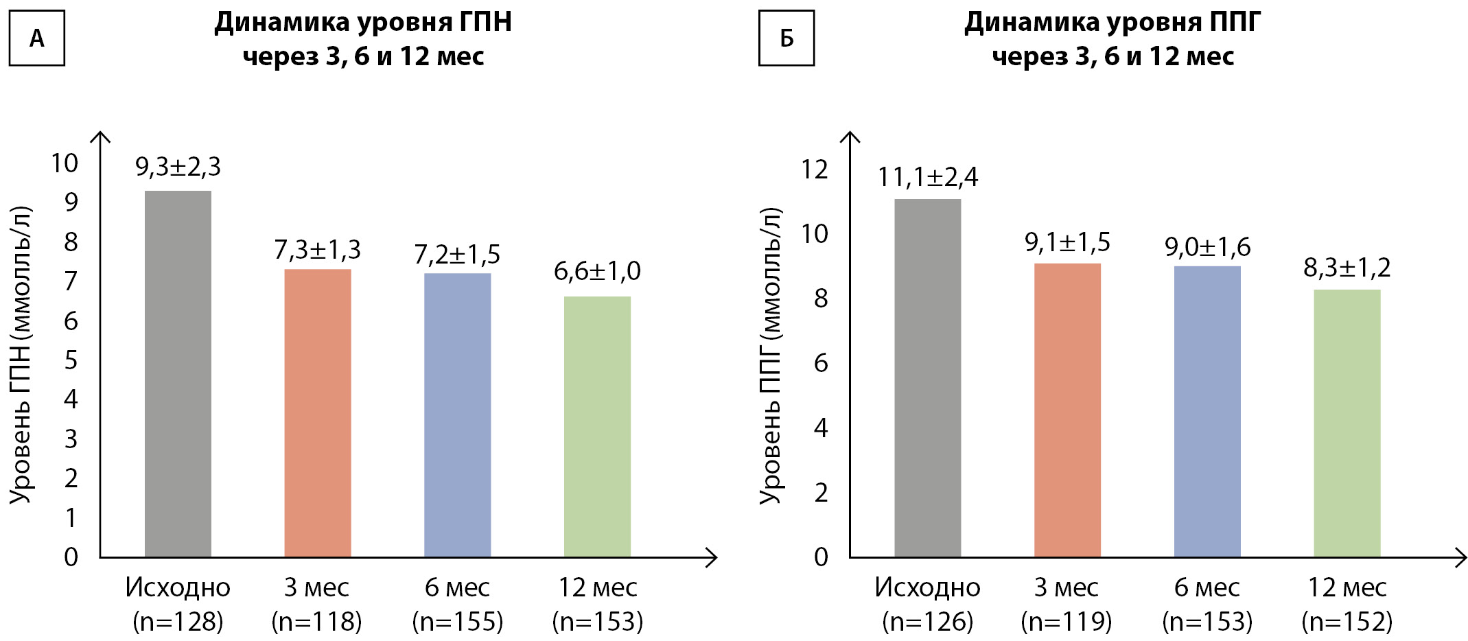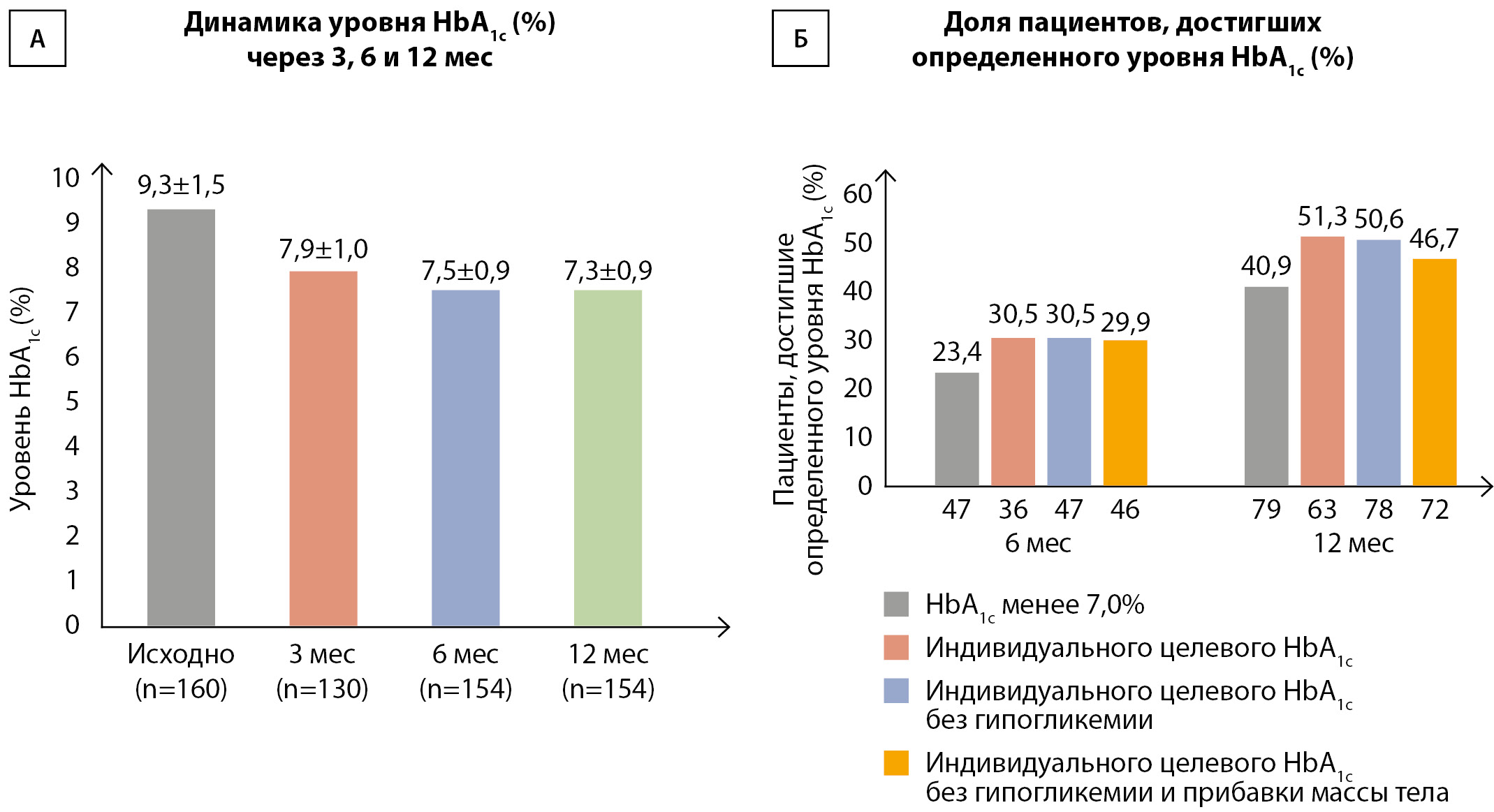 РЕЗУЛЬТАТЫ. Средний возраст пациентов в российской популяции составил 60,8±9,4 года; длительность СД2 — 11,4 года, HbA1c — 9,3±1,5%, ИМТ — 33,3 кг/м2. До включения в исследование большинство пациентов находились на терапии 2 ПССП (36,3%) и 3 ПССП (27,5%), на терапии инсулином — 32,5%. Среднее снижение HbA1c через 6 мес составило -1,81%, через 12 мес -2,03%. Через 12 мес 51,3% пациентов достигли индивидуальных целевых значений HbA1c и 46,7% пациентов достигли 3-компонентной цели по HbA1c с отсутствием подтвержденных или тяжелых гипогликемий и набора массы тела. Снижение массы тела через 12 мес составило -3,3±4,4 кг. За период исследования было зарегистрировано 17 случаев гипогликемии (0,106 событий на пациенто-год); 1 эпизод тяжелой гипогликемии (0,006 событий на пациенто-год). Общее число НЯ — 43 (26,9%), серьезных НЯ — 10 (6,3%).