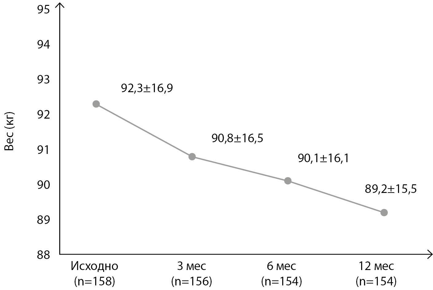 5. Рисунок 5. Динамика массы тела через 3, 6 и 12 месяцев. | |