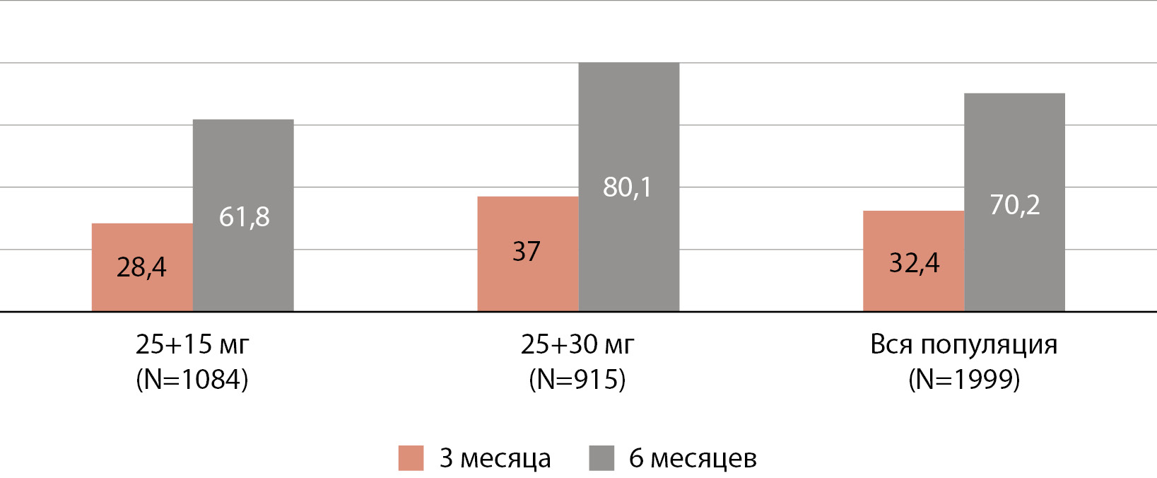 По данным исследования, через 6 мес наблюдения 70,2% пациентов независимо от дозы достигали целевых уровней HbA1c; количество пациентов, принимавших Инкресинк в дозе 25 мг+30 мг 1 раз/сут и достигших целевых показателей HbA1c, составило 80,1%. При этом около трети пациентов достигли целевых значений уже через 3 мес терапии.