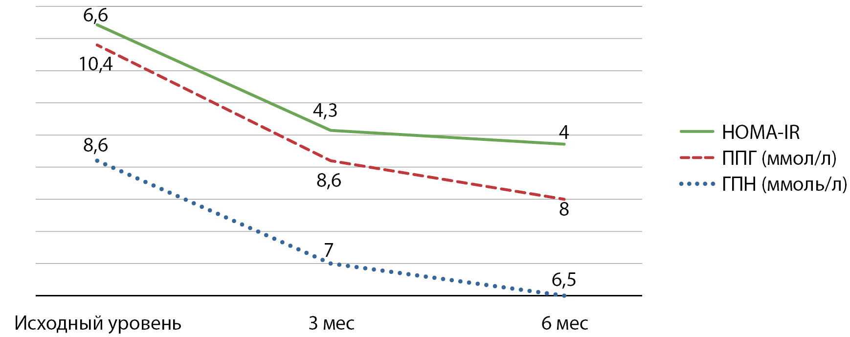 Вторичные конечные точки включали динамику показателей содержания глюкозы в плазме натощак (ГПН) и постпрандиальной гликемии (ППГ), определяемой двухчасовым глюкозотолерантным тестом с 75 г глюкозы (ПГТТ); долю пациентов, ответивших на терапию в виде снижения HbA1c≥0,3%; динамику показателей липидов в плазме крови; динамику индексов инсулинорезистентности HOMA-IR и функции β-клеток HOMA-β (формулы расчета: HOMA-IR = инсулин натощак (мкЕд/мл) * глюкоза натощак (ммоль/л) / 22,5. HOMA-B = (20 × инсулин натощак (мкЕд/мл)) / (глюкоза натощак (ммоль/л) — 3,5); динамику массы тела, индекса массы тела (ИМТ), окружности талии; уровня систолического (САД) и диастолического артериального давления (ДАД), частоты сердечных сокращений (ЧСС); динамику лабораторных показателей (рСКФ, величина альбуминурии) относительно исходных значений.