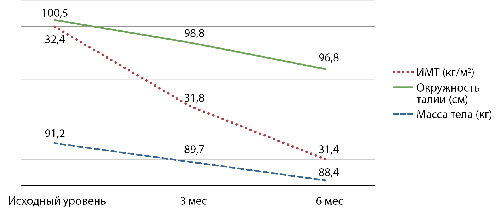 Наблюдение за пациентами продолжалось 6 мес, за это время проводилось три визита: включение (Визит 1), наблюдение через 3 мес от включения (Визит 2) и заключительный визит через 6 мес (Визит 3). Во время Визита 1 назначался препарат Инкресинк в рамках рутинной практики, в Визиты 2 и 3 проводилась оценка эффективности терапии, антропометрических показателей, уровня САД и ДАД, мониторинг нежелательных явлений (НЯ). Во время всех визитов собирались данные рутинного лабораторного обследования.