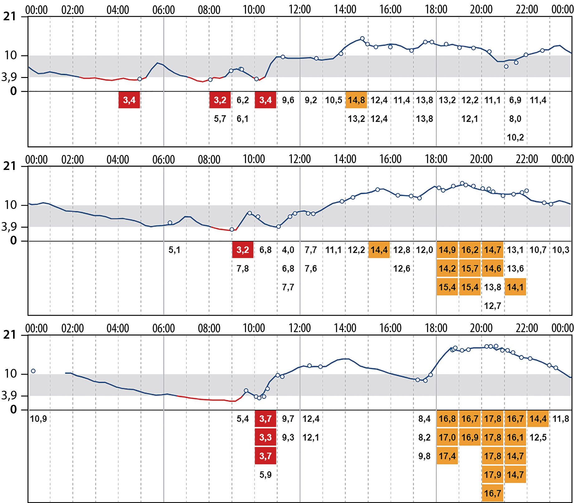 Рисунок 7. Результаты непрерывного мониторирования глюкозы на фоне базис-болюсной инсулинотерапии после панкреатэктомии.