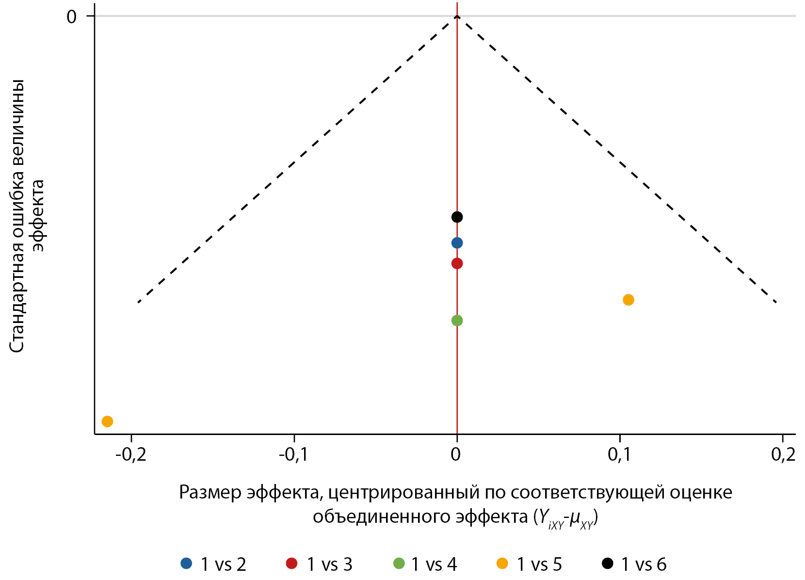 При изучении потенциальных систематических ошибок, связанных с пропуском данных во включенных в СМА публикациях, выполнялось построение воронкообразного графика [16]. При отсутствии предвзятости публикации предполагалось, что исследования с высокой точностью будут отображены вблизи центрального значения, а исследования с низкой точностью будут равномерно распределены по обе стороны от центрального значения, создавая воронкообразное распределение, что может указывать на наличие систематической ошибки в публикации.