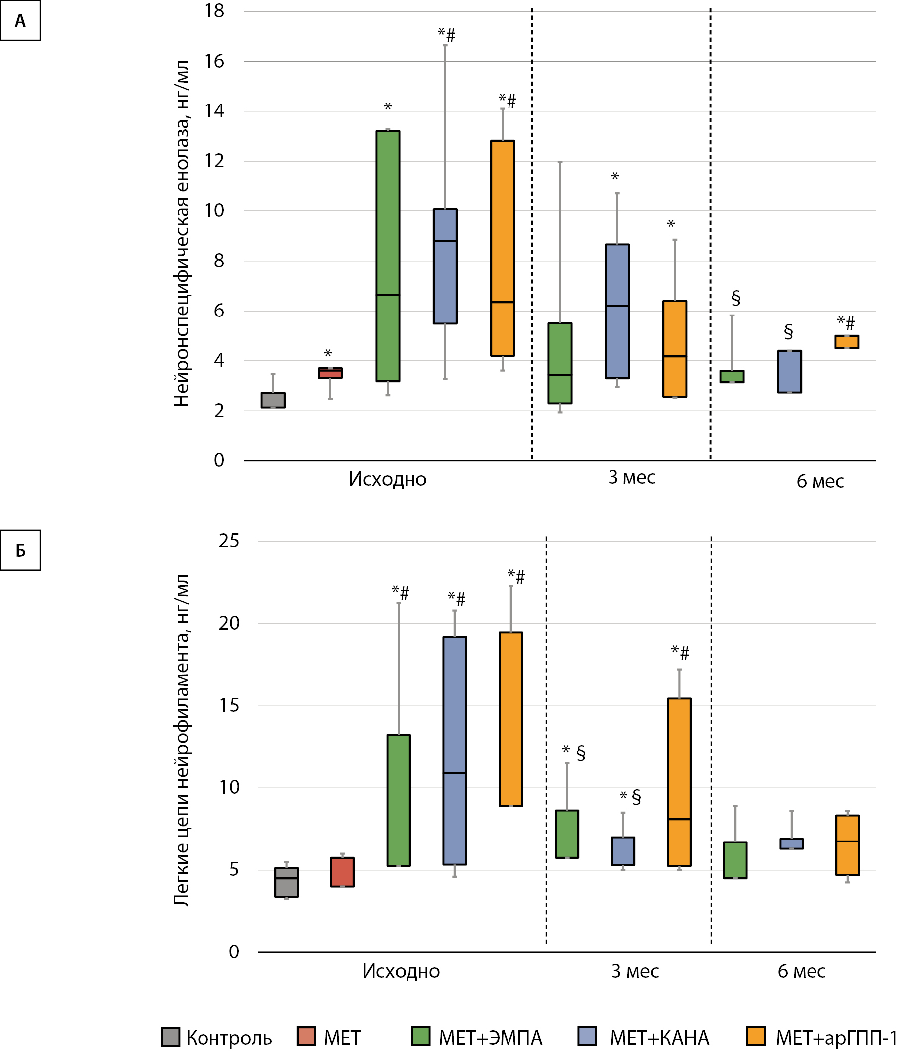 1. Рисунок 1. Динамика маркеров нейронального повреждения на фоне терапии ингибиторами натрий-глюкозного котранспортера 2 типа или агонистами рецепторов глюкагоноподобного пептида-1. (А) Динамика концентрации нейрон-специфической енолазы. (Б) Динамика концентрации легких цепей нейрофиламента.