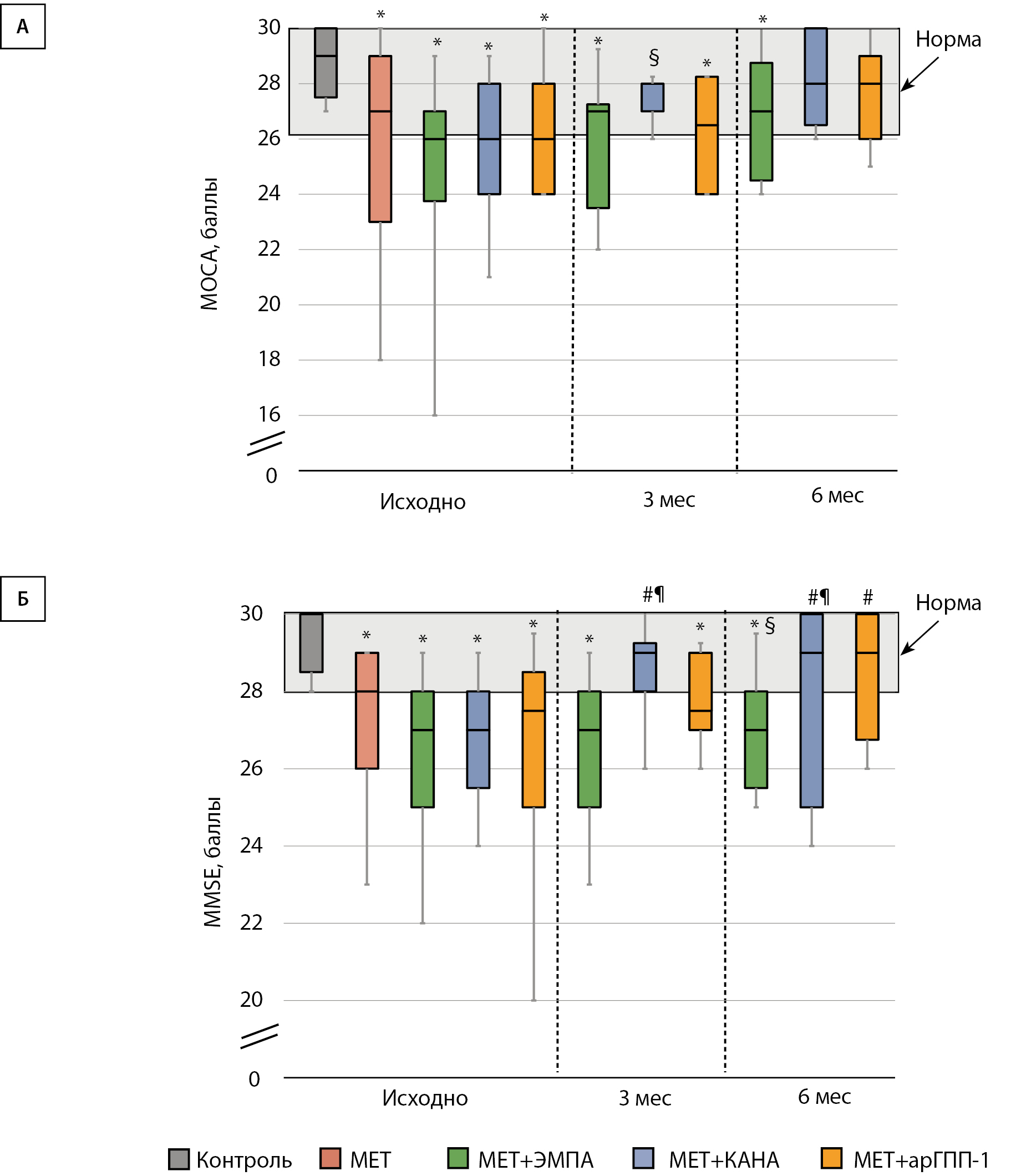 2. Рисунок 2. Динамика параметров когнитивного статуса на фоне терапии ингибиторами натрий-глюкозного котранспортера 2 типа или агонистами рецепторов глюкагоноподобного пептида-1. (А) Данные по Монреальской шкале когнитивной оценки (МОСА). (Б) Данные по Краткой шкале оценки психического статуса (MMSE).
