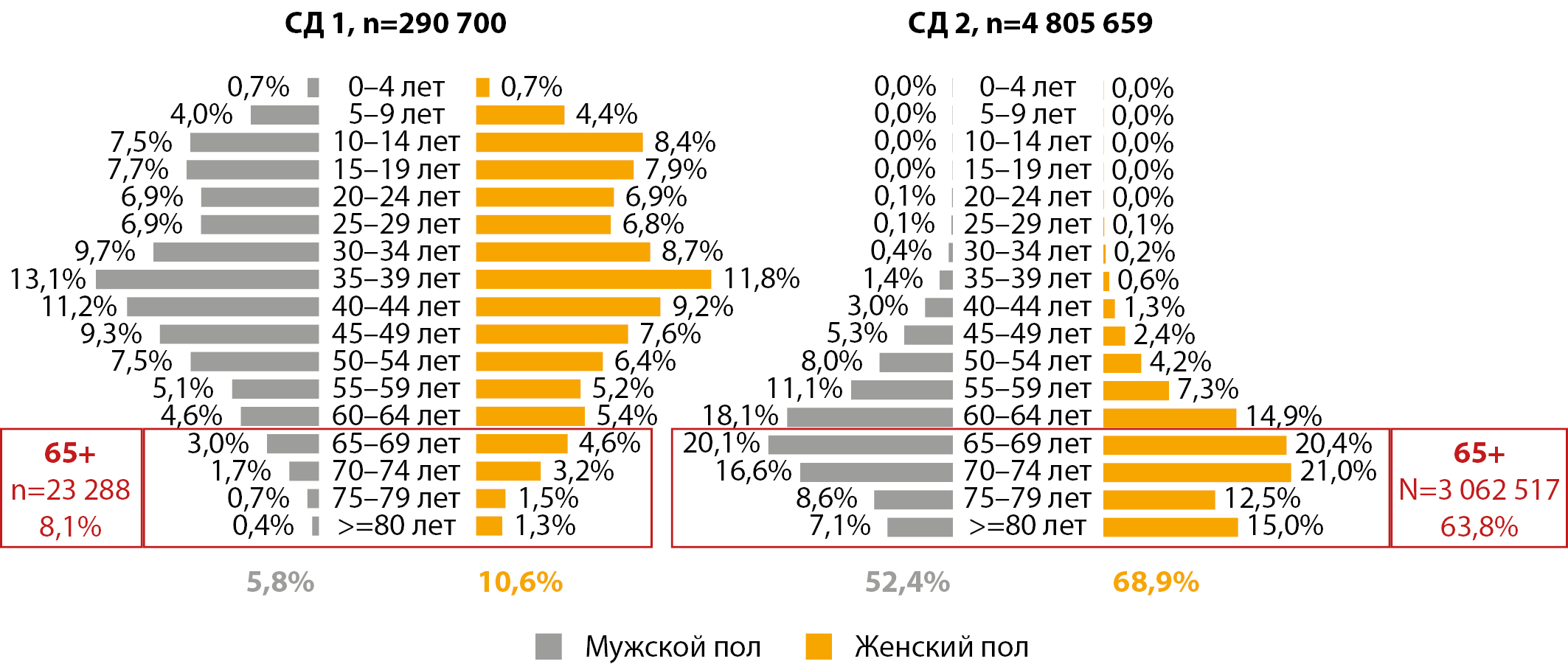 При анализе гендерного состава отмечено, что 74% (2,3 млн) от общего количества пациентов «65+» составляют женщины с СД2, что в целом отражает гендерную структуру общей популяции РФ. Доля мужчин старше 65 лет от общего количества пациентов с СД1 мужского пола составила 5,8%, с СД2 — 52,4%, доля женщин с СД1 «65+» среди всех пациентов с СД1 женского пола — 10,6%, доля женщин «65+» среди женщин с СД2 — 68,9% (рис. 1).