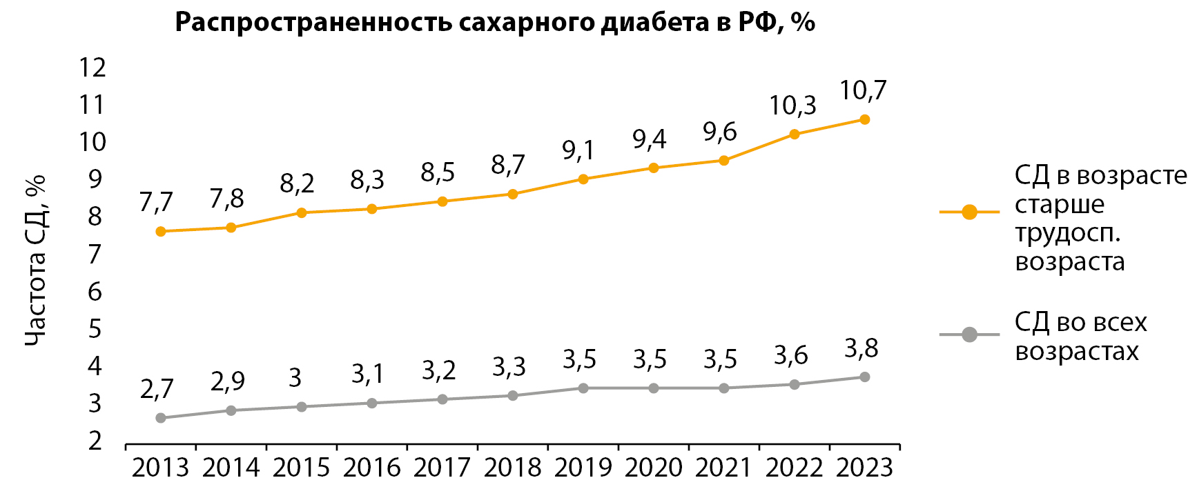 Рисунок 2. Данные Росстата: распространенность сахарного диабета во всех возрастных группах и среди лиц старше трудоспособного возраста. (Данные на 01.01.2013–2021 гг. пересчитаны с учетом итогов Всероссийской переписи населения 2020 г. Лица старше трудоспособного возраста в период 2013–2019 гг.: мужчины в возрасте 60 лет и более, женщины — 55 лет и более; 2020, 2021 гг.: мужчины в возрасте 61 лет и более, женщины — 56 лет и более; 2022, 2023 гг.: мужчины в возрасте 62 года и более, женщины — 57 лет и более. Начиная с 2015 г. — с учетом сведений по Республике Крым и г. Севастополь [2]).