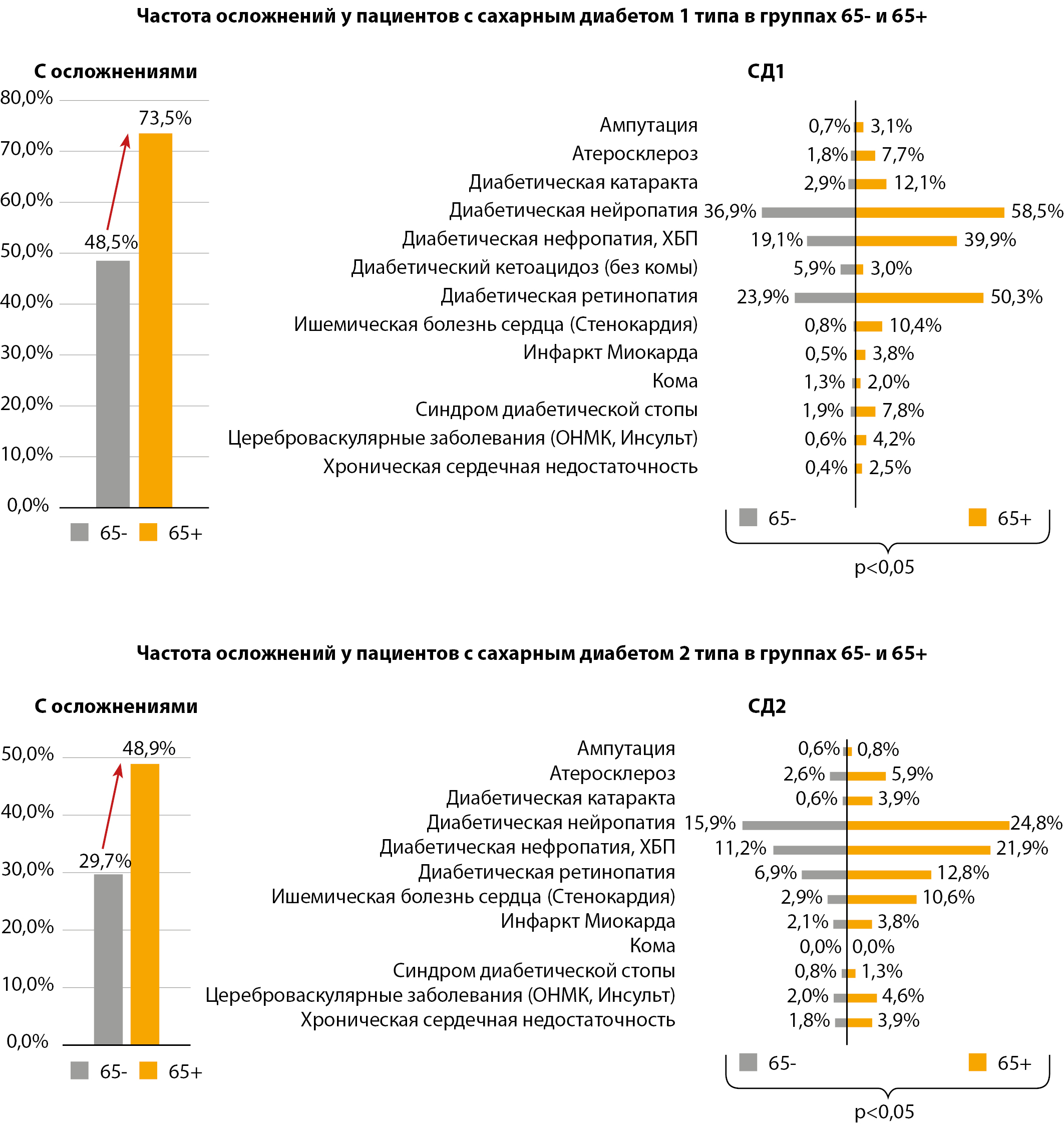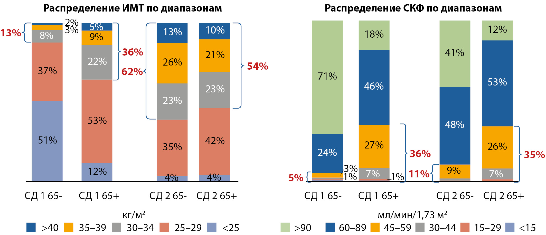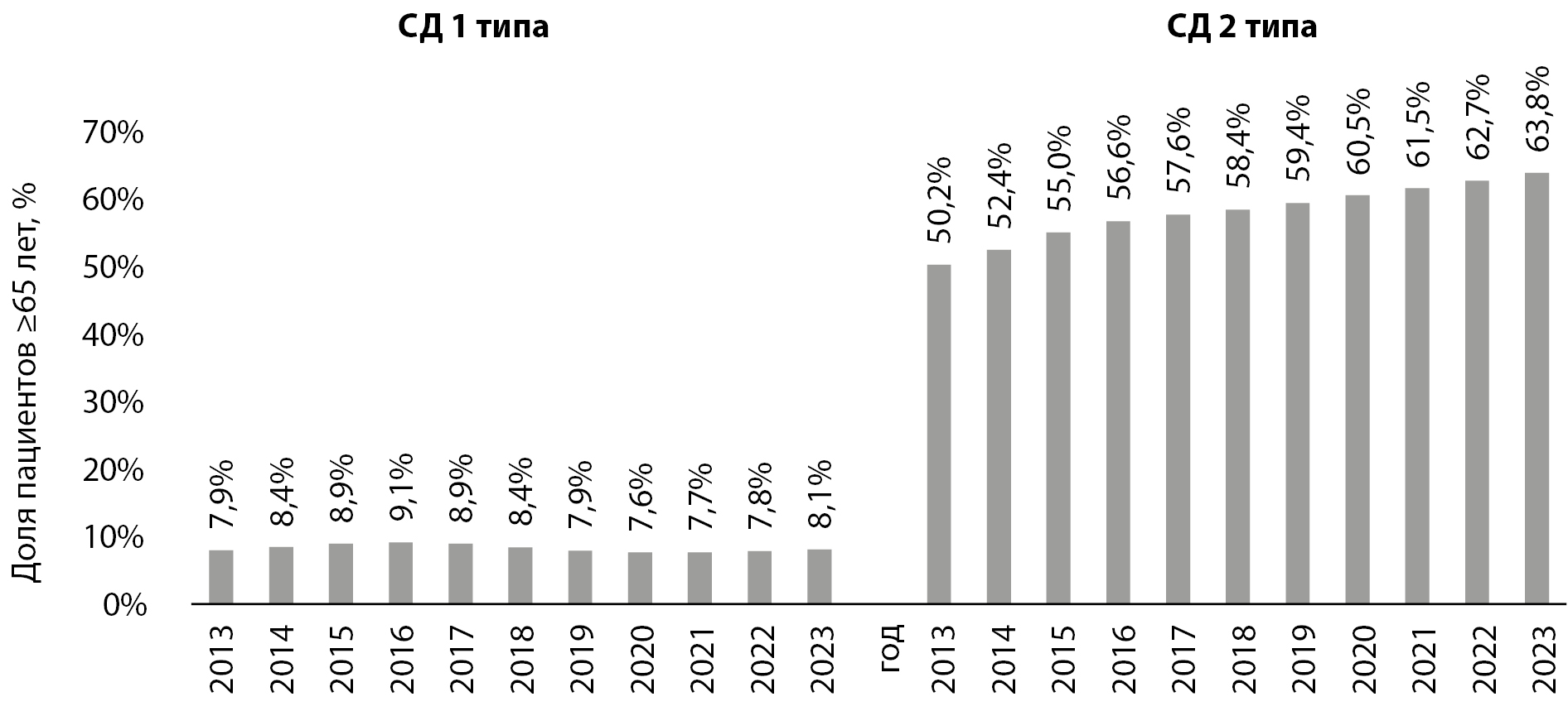 РЕЗУЛЬТАТЫ. Количество пациентов в возрасте «65+» составило 3 085 805 человек — 59,3% от общей численности пациентов с СД; из них с СД2 — 3 062 517 (63,8%), с СД1 — 23 298 (8,1%). За период 2013–2023 гг. отмечен прирост доли лиц пожилого возраста при СД2 с 50,2% до 63,8%, при СД1 с 7,9% до 8,1%. При СД2 доля пациентов, дебютирующих в возрасте старше 60 лет, увеличилась с 51 до 63%. Клинические характеристики в группах «65+» и «65-» статистически значимо различались: при СД1 уровень гликированного гемоглобина (HbA) 7,8 vs 8,0%, расчетная скорость клубочковой фильтрации (рСКФ) — 75,0 vs 107,2 мл/мин/1,73 м², индекс массы тела (ИМТ) — 26,9 vs 23,2 кг/м²; при СД2 — 7,3 vs 7,5%, 73,1 vs 89,1 мл/мин/1,73 м², 30,9 vs 32,0 кг/м² соответственно. Доля лиц с ожирением (ИМТ>30 кг/м²) возрастала у лиц старше 65 лет с СД1 с 13 до 36% и уменьшалась при СД2 с 62 до 54%. В группе пациентов старшего возраста при обоих типах СД отмечалась более высокая частота диабетических осложнений с сочетанным поражением органов-мишеней — хроническая болезнь почек, атеросклеротические сердечно-сосудистые заболевания, хроническая сердечная недостаточность при СД1 в среднем в 4,6 раза, при СД2 — в 2,2 раза. В структуре ССТ в группе «65+» преобладали препараты сульфонилмочевины (СМ) 45,3% vs 35,0% и снижалась доля метформина и препаратов с органопротективными эффектами (иДПП-4, иНГЛТ-2, арГПП-1).