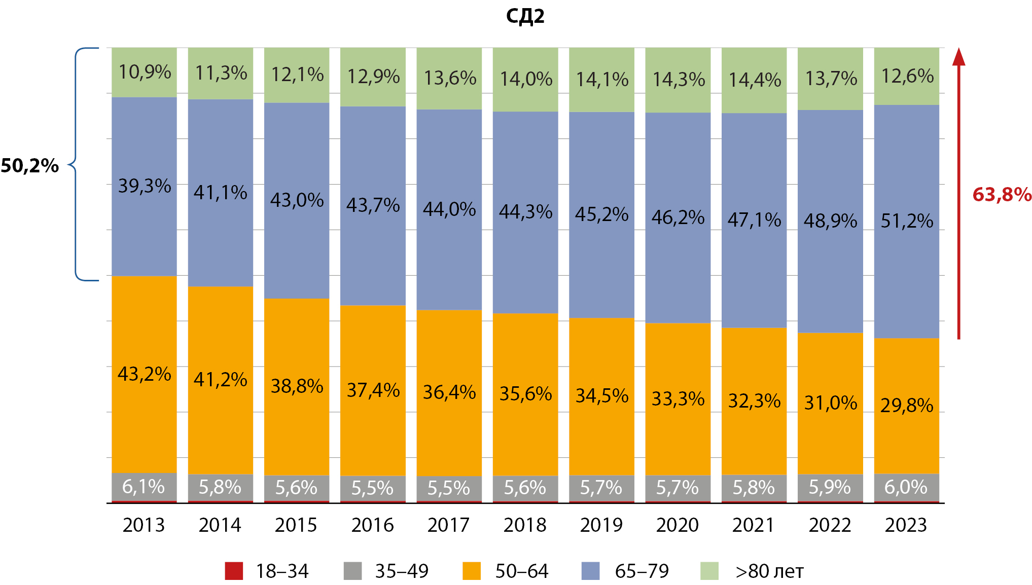 Принимая во внимание, что основная масса пациентов старшей возрастной группы — это пациенты с СД2, мы провели анализ распределения пациентов с СД2 по возрастным диапазонам (рис. 4). При анализе отмечается увеличение доли пациентов СД2 «65+» — с 50,2% в 2013 г. до 63,8% в 2023 г. с ­преимущественным ­приростом лиц в возрасте 65–79 лет и значительным уменьшением доли пациентов в возрасте 50–64 лет с 43,2 до 29,8% (рис. 4).