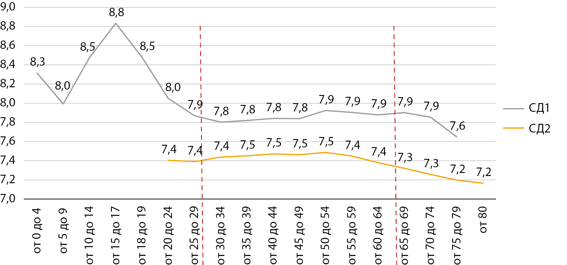 Обсуждая особенности течения СД в аспекте возраста, в первую очередь следует определиться с терминологией. Надо отметить, что единые критерии старшего или пожилого возраста в настоящий момент не установлены. Всемирная организация здравоохранения (ВОЗ) предлагает следующую классификацию возрастных групп: 60–74 года — пожилой возраст; 75–89 лет — старческий возраст; 90 лет и старше — долгожители [5]. В свою очередь ООН относит к пожилому возрасту лиц старше 65 лет. При этом очевидно, что данные отрезные точки сложились скорее исторически, чем биологически. При современном уровне жизни человек в возрасте 60–65 лет уже не является и не воспринимается «пожилым» в контексте сохранности физического здоровья, ментальной и социальной активности. Тем не менее, с точки зрения статистического подхода, традиционным началом старшего возраста считается 65 лет, что связано с пенсионным возрастом в большинстве стран мира. В РФ принята классификация пожилого возраста ВОЗ, однако учет старшей возрастной группы в официальных статистических ресурсах проводится по количеству лиц «старше трудоспособного возраста». На момент 2024 г., согласно изменениям данной позиции в законодательстве, это возраст 56 лет у женщин и 61 год у мужчин, с дальнейшим поэтапным ежегодным повышением к 2028 г. до 60 и 65 лет, соответственно [6]. Общее количество лиц старше трудоспособного возраста на 01.01.2024 г. — 34,6 млн человек, что составляет почти четверть населения РФ (23,7%) [2].