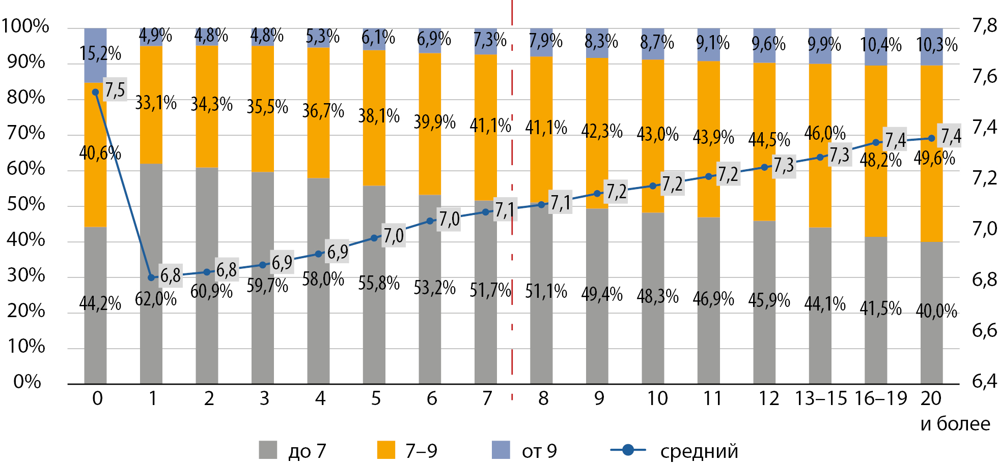 11. Рисунок 11. Динамика среднего показателя и распределения по диапазонам гликированного гемоглобина (%) в зависимости от длительности сахарного диабета 2 типа на основе Базы Данных клинико-эпидемиологического мониторинга сахарного диабета в Российской Федерации.