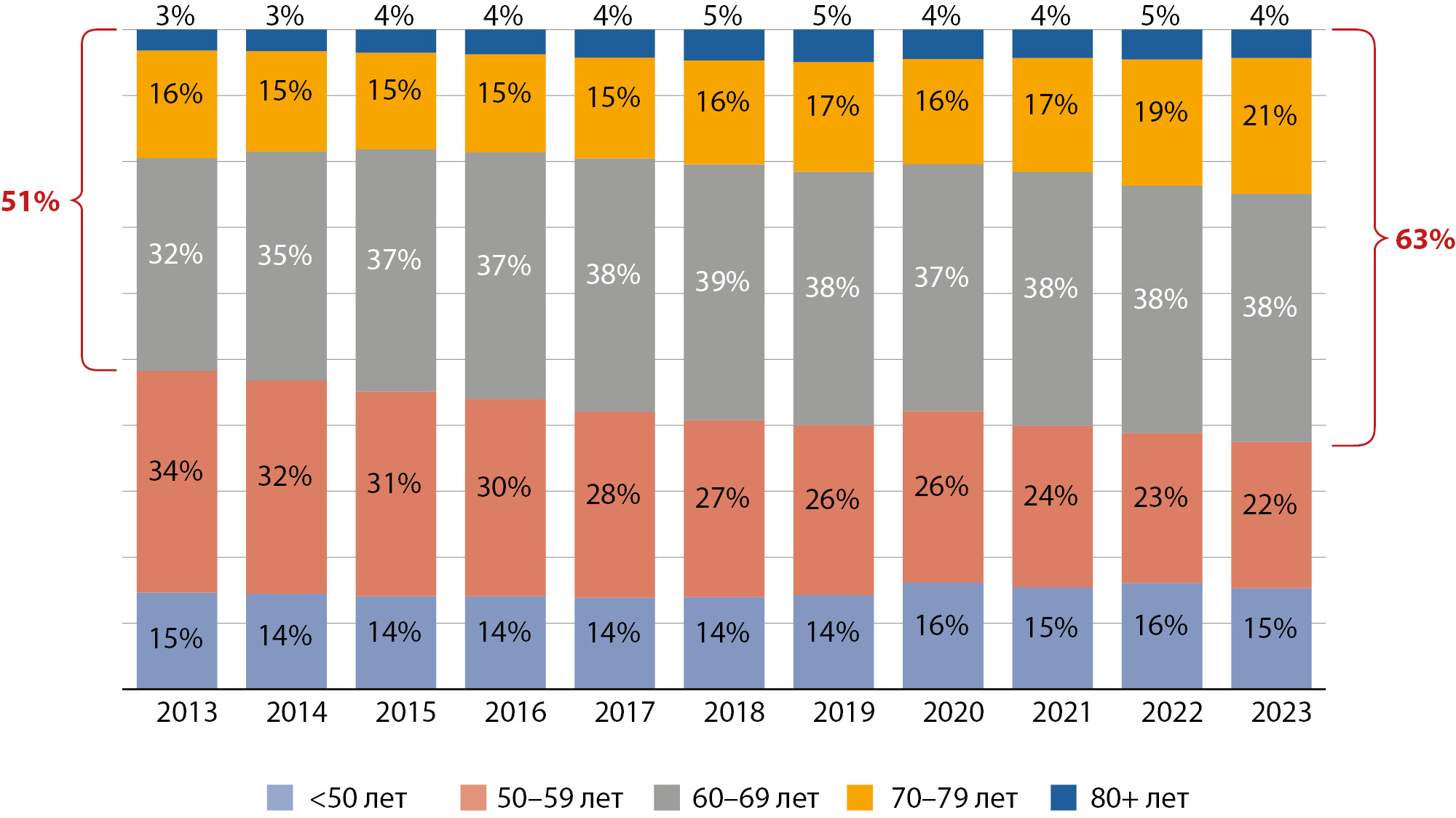 4. Figure 4. Distribution of patients with type 2 diabetes mellitus by age groups from 2013 to 2023 based on the Database of Clinical and Epidemiological Monitoring of Diabetes Mellitus in the Russian Federation. | |