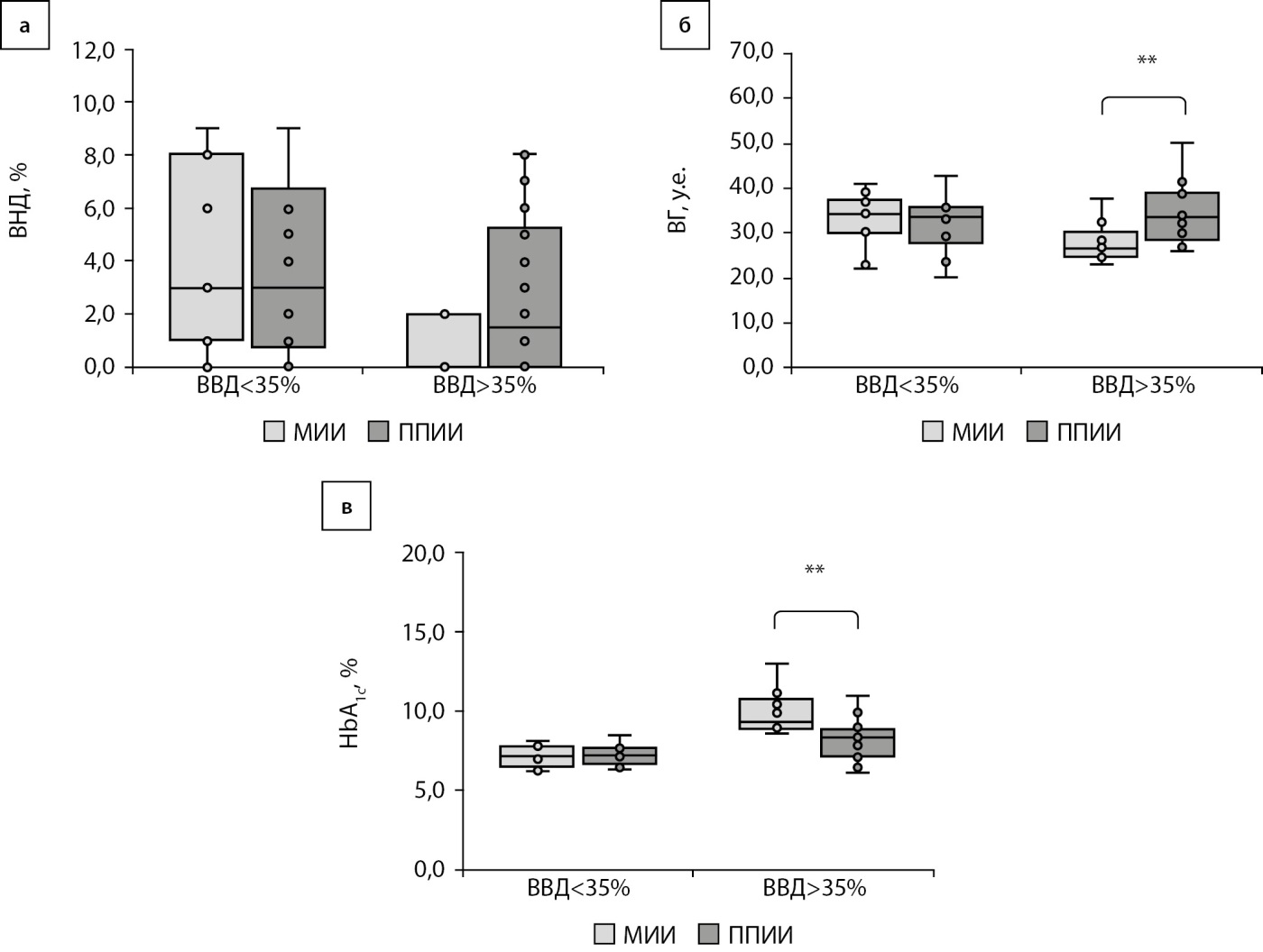 Примечание: ВГ — вариабельность гликемии; HbA1c — гликированный гемоглобин; ВВД — время выше целевого диапазона; ВНД — время ниже целевого диапазона; МИИ — множественные инъекции инсулина; ППИИ — постоянная подкожная инфузия инсулина.