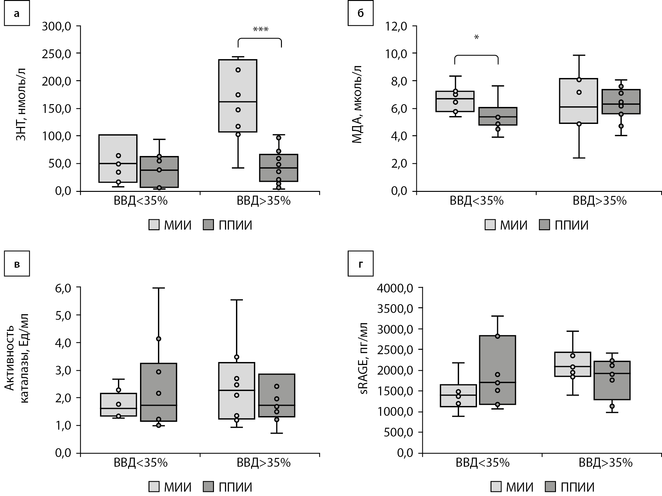 Длительность нахождения в целевом диапазоне в группах 1А (на МИИ) и в группе 2А (на ППИИ) значимо не отличалась и составила 74,0 [ 70,0; 81,0]% и 68,0 [ 64,0; 77,0]% времени суток соответственно, p>0,15. Отличий длительности гипогликемического состояния в группе 1А и в группе 2А также не выявлено: 3,0 [ 1,0; 8,0] и 3,0 [ 1,0; 6,0]% времени суток, p>0,9. В подгруппе женщин с СД1, использующих МИИ (1Б), показатель ВВД составил: 82,0 [ 57,0; 90,0]% времени суток, в группе использующих ППИИ (2Б) — 52,5 [ 42,0;76,0]% (p<0,01). Уровень глюкозы в целевом диапазоне в подгруппе 1Б (МИИ) был 16,0 [ 10,0; 37,0]% времени суток, в подгруппе 2Б (ППИИ) — 40,0 [ 23,0; 53,0]%, p<0,05. С целью изучения влияния ОС на состояние овариального резерва женщин с СД1 проведен анализ показателей одного из наиболее информативных маркеров ОС — нитротирозина. Уровень нитротирозина не отличался в группе женщин, использующих МИИ (гипергликемия у которых не превышала более 35% времени суток), и составил 49,6 [ 16,5; 102,40] нмоль/л, у женщин на ППИИ — 38,2 [ 6,4; 59,9] нмоль/л. В группе женщин с хронической гипергликемией, превышающей 35% времени суток, группа 1Б, этот показатель составил 161,4 [ 110,6; 232,1] нмоль/л и был значительно выше, чем в группе ППИИ (2Б) 42,4 [ 19,1; 64,9] нмоль/л, p<0,01 (рис. 1а). Различия в уровне продуктов перекисного окисления липидов — МДА между женщинами, использующими МИИ и ППИИ, установлены исключительно в отношении группы с ВВД<35% (рис. 1б). Зависимости изменения активности каталазы и уровня sRAGE от используемого режима инсулинотерапии обнаружено не было (рис. 1в, г), однако показана их корреляционная зависимость в группе 2А (rs=0,857; p<0,05). В данной группе уровень sRAGE положительно коррелировал с уровнем HbA1c (rs=0,821; p<0,05) и отрицательно — с объемом яичника (rs=-0,785; p<0,05). В группе МИИ показана положительная корреляция sRAGE с HbA1с (rs=0,701; p<0,05). Среди всей выборки уровень sRAGE положительно коррелировал с процентом времени нахождения выше целевого диапазона (rs=0,431; p<0,05) и, соответственно, отрицательно — с длительностью нахождения в целевом диапазоне (rs=-0,424; p<0,05).