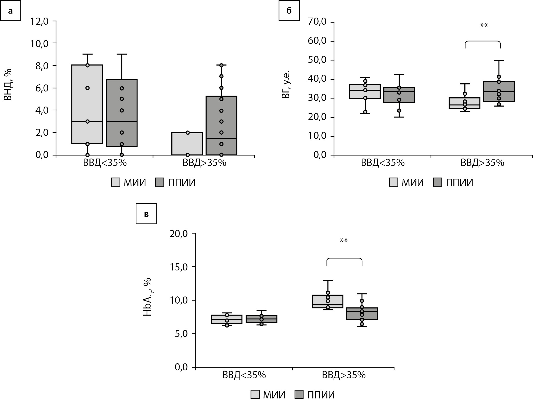 Уровень HbA1c был сопоставим у женщин с СД1, использующих МИИ и ППИИ, не превышающих длительность нахождения выше целевого диапазона более 35%, и был выше у женщин, использующих МИИ, в группе ВВД более 35% (рис. 2в).