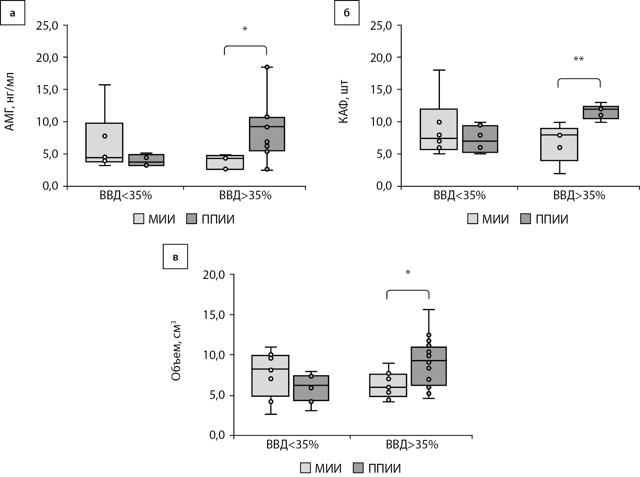 ВГ является одним из предикторов развития сосудистых осложнений СД. В группе женщин удовлетворительного контроля 1А и 2А показатель ВГ в группе МИИ составил 34,3 [ 30,1; 37,3]%, в группе ППИИ — 33,5 [ 29,2; 35,7]%. В подгруппах с преобладанием гипергликемии 1Б и 2Б показатель ВГ у женщин, использующих МИИ, был 26,6 [ 25,0; 28,4], в группе женщин на ППИИ — 33,5 [ 28,4; 38,8] (рис. 2б). Тенденция к изменению КАФ была выявлена при превышении целевого диапазона (уровня глюкозы выше 7,8 ммоль/л) более 35% времени суток. Уровень ФСГ в группах, использующих МИИ и ППИИ, соответствовал референсному интервалу, отличий данного показателя в группах сравнения не было. Уровень АМГ имел тенденцию к повышению в группе женщин, использующих ППИИ, особенно в группе с ВВД>35% (p<0,05), но не превышал референсного интервала в обеих группах (рис. 3а). КАФ при неудовлетворительном контроле составило в группе 1Б — 8,0 [ 6,0; 8,0], в группе 2Б — 12,0 [ 11; 12,0], p<0,01. Объем яичника в группе 1Б был 6,0 [ 5,4; 7,5] см³ в группе 2Б — 9,4 [ 6,5; 10,8], p<0,05 (рис. 3 б, в).