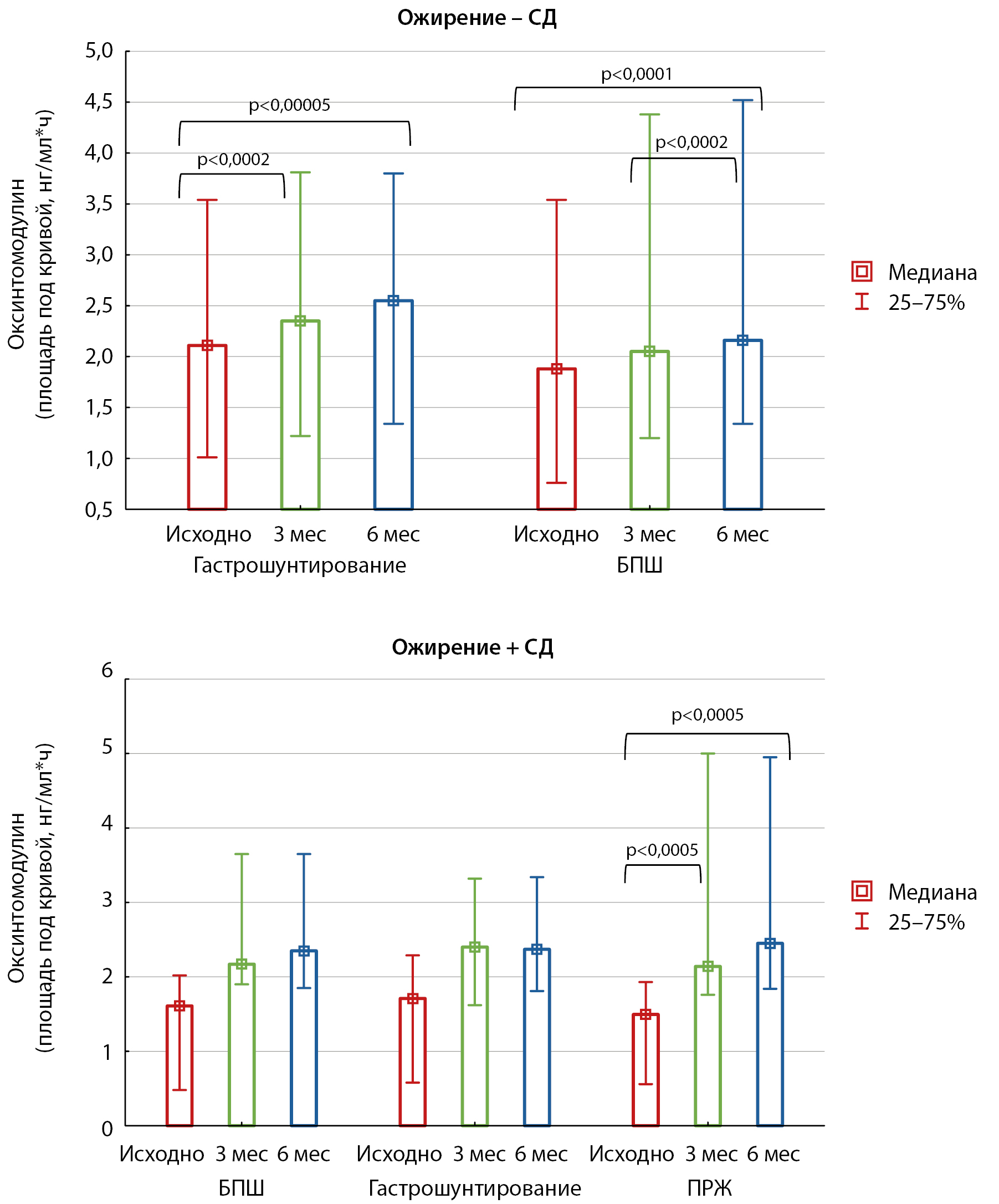 РЕЗУЛЬТАТЫ. В исследовании приняли участие 86 пациентов: 44 с ожирением, но без нарушений углеводного обмена, и 42 пациента с ожирением и СД2. Основные характеристики, такие как возраст, рост, масса тела, индекс массы тела (ИМТ), окружность талии и бедер, в обеих группах были сопоставимы. У пациентов без нарушений углеводного обмена наблюдалась менее выраженная инсулинорезистентность, меньшая гиперглюкагонемия и сохранная секреция ГПП-1. Более того, изначально в этой группе фиксировались более высокие уровни оксинтомодулина по сравнению с пациентами с СД2 (площадь под кривой 2,08 [1,61; 2,50] нг/мл*ч против 1,64 [1,07; 1,78] нг/мл*ч, p<0,00005). В результате снижения массы тела после бариатрического вмешательства секреция оксинтомодулина возросла в обеих группах (площадь под кривой в группе без СД2: 2,35 [1,9; 3,28] нг/мл*ч через 3 месяца, 2,55 [2,02; 3,35] нг/мл*ч через 6 месяцев, p<0,00001; в группе с СД2: 2,27 [1,95; 2,61] нг/мл*ч через 3 месяца; 2,4 [1,99; 2,72] нг/мл*ч через 6 месяцев, p<0,00001) при отсутствии значимых межгрупповых различий через 3 и 6 месяцев после операции.