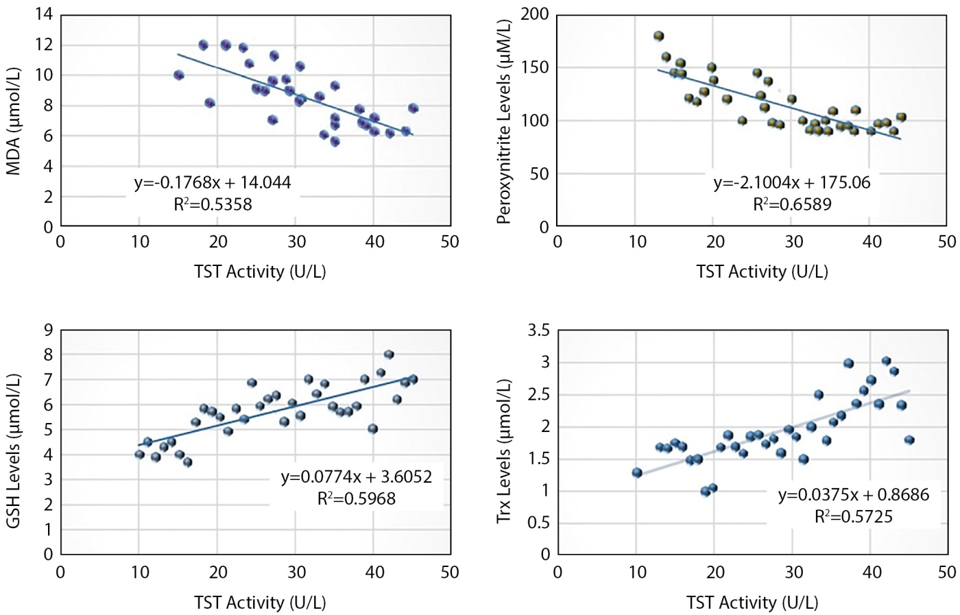 Figure 1. The correlation of TST activity with MDA ,Peroxynitrite, Trx and GSH