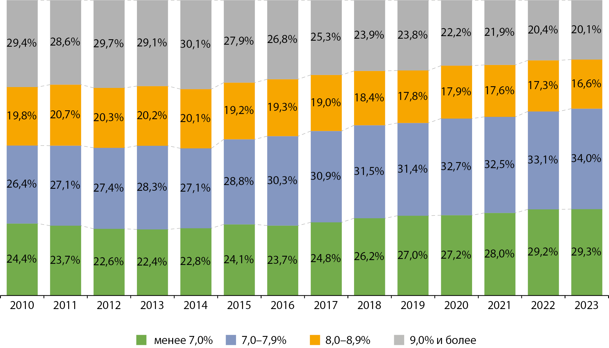 Рисунок 1б. Диапазоны распределения по уровню HbA1c (лабораторно-измеренный показатель) у пациентов с сахарным диабетом 2 типа, все возрастные группы, в динамике 2010–2023 гг., на основе «Базы данных клинико-эпидемиологического мониторинга сахарного диабета на территории Российской Федерации» (87 регионов).