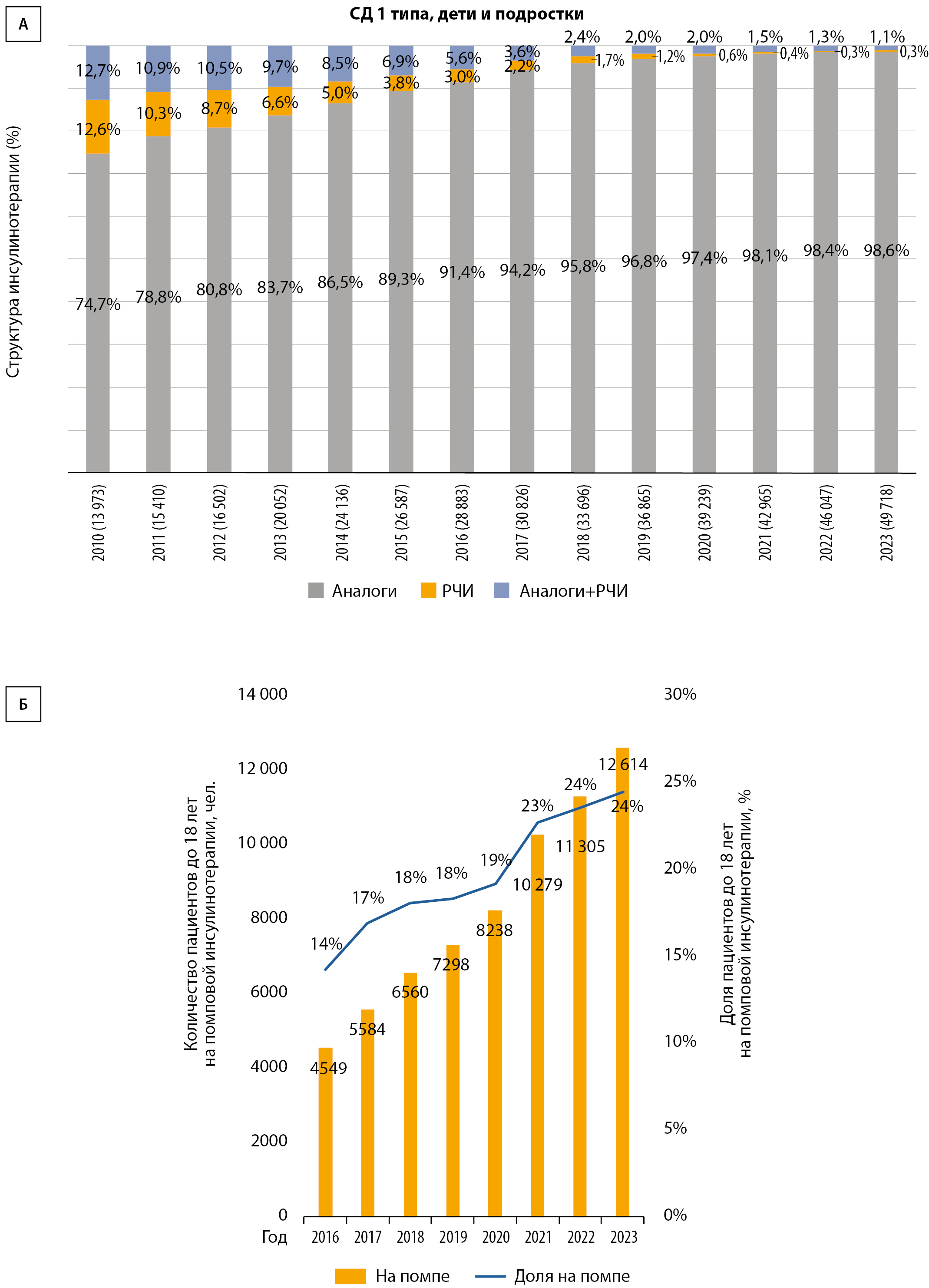 5. Рисунок 4. Динамика структуры инсулинотерапии (аналоги, рекомбинантный человеческий инсулин (РЧИ), их сочетание) (А) и помповой инсулинотерапии (Б) у пациентов с сахарным диабетом 1 типа до 18 лет, в динамике 2010–2023 гг. и 2016–2023 гг., на основе «Базы данных клинико-эпидемиологического мониторинга сахарного диабета на территории Российской Федерации» (87 регионов).