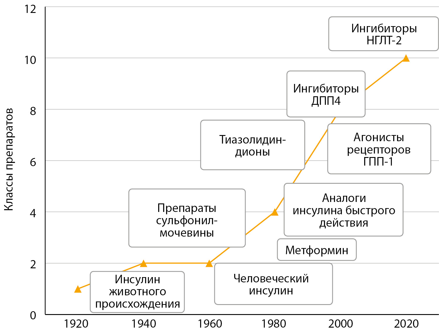 Рисунок 1. Эволюция сахароснижающей терапии за последние 100 лет.