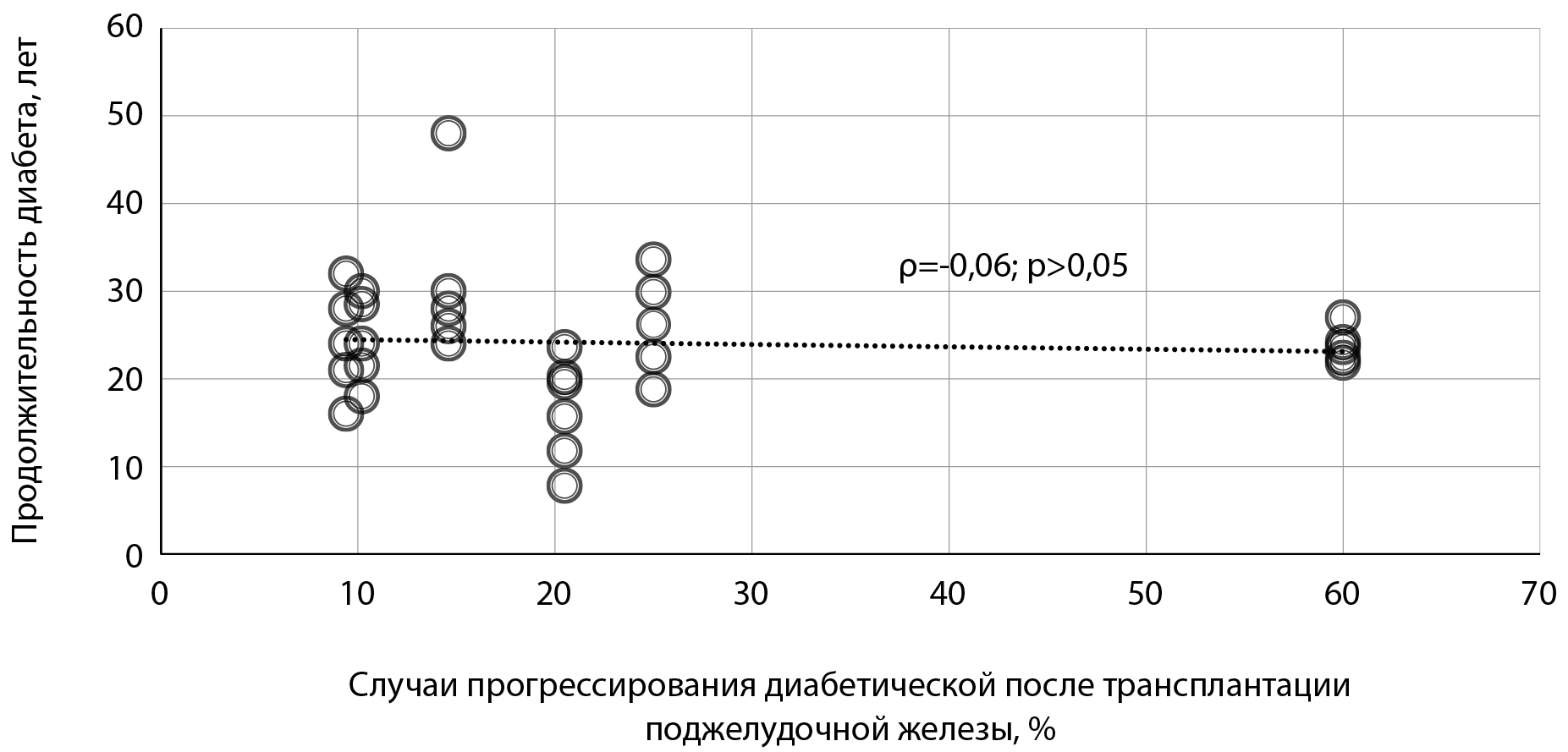 1. Рисунок 1. График зависимости прогрессирования диабетической ретинопатии после трансплантации поджелудочной железы от длительности течения сахарного диабета в предтрансплантационном периоде [11, 21–25].