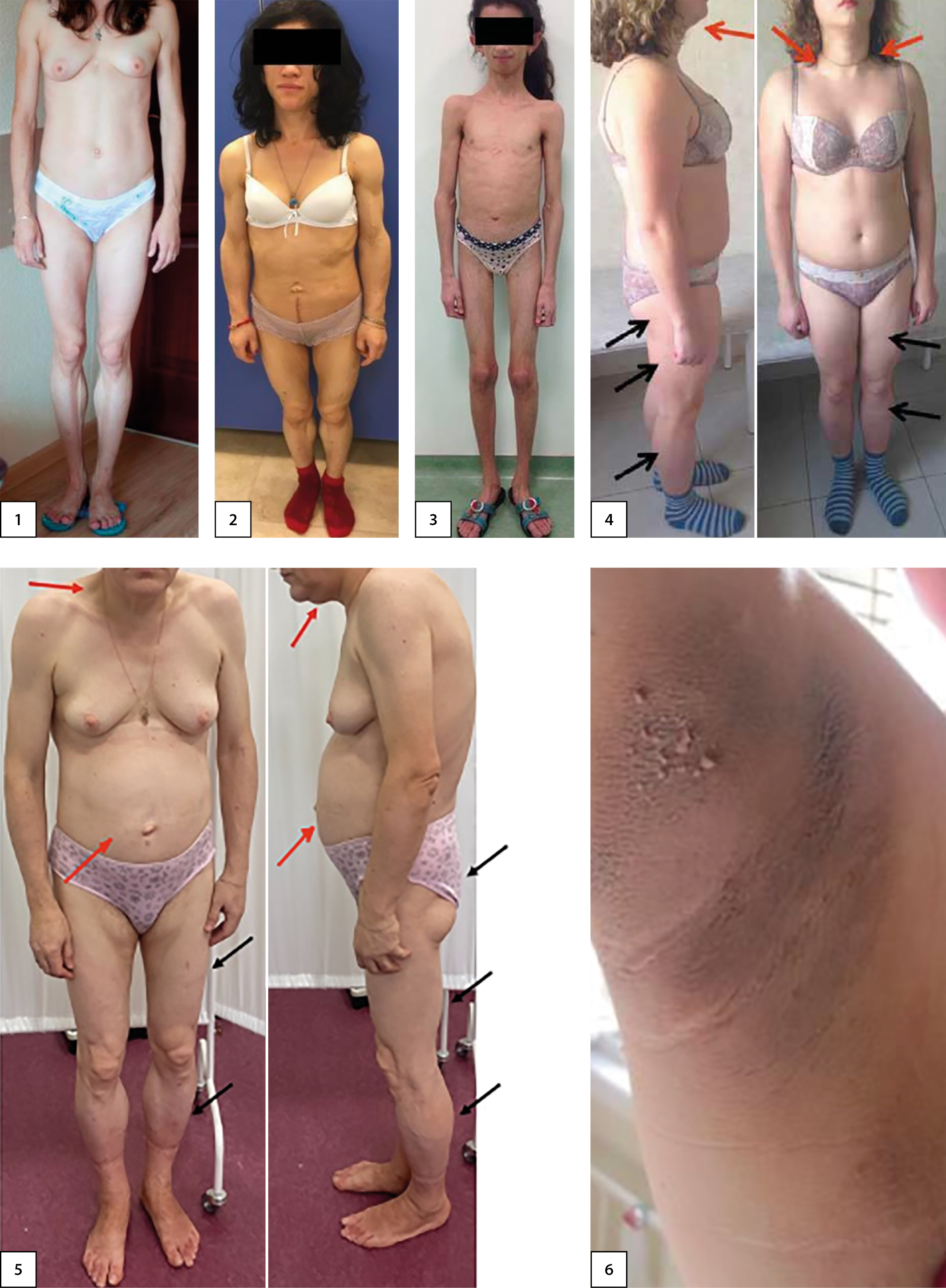 1. Рисунок 1. Фенотип пациенток с различными формами наследственных липодистрофий (из архива ГНЦ РФ ФГБУ «НМИЦ эндокринологии им. академика И.И. Дедова» Минздрава России). На 1 и 2 фотографиях — пациентки с генерализованными липодистрофиями, фотография 3 — атипичный прогероидный синдром (мутация в гене LMNA), фотографии 4 и 5 — пациентки с семейными парциальными липодистрофиями, фотография 6 — acanthosis nigricans подмышечной впадины. Красной стрелкой обозначены зоны липогипертрофии; черной — зоны липодистрофии. | |