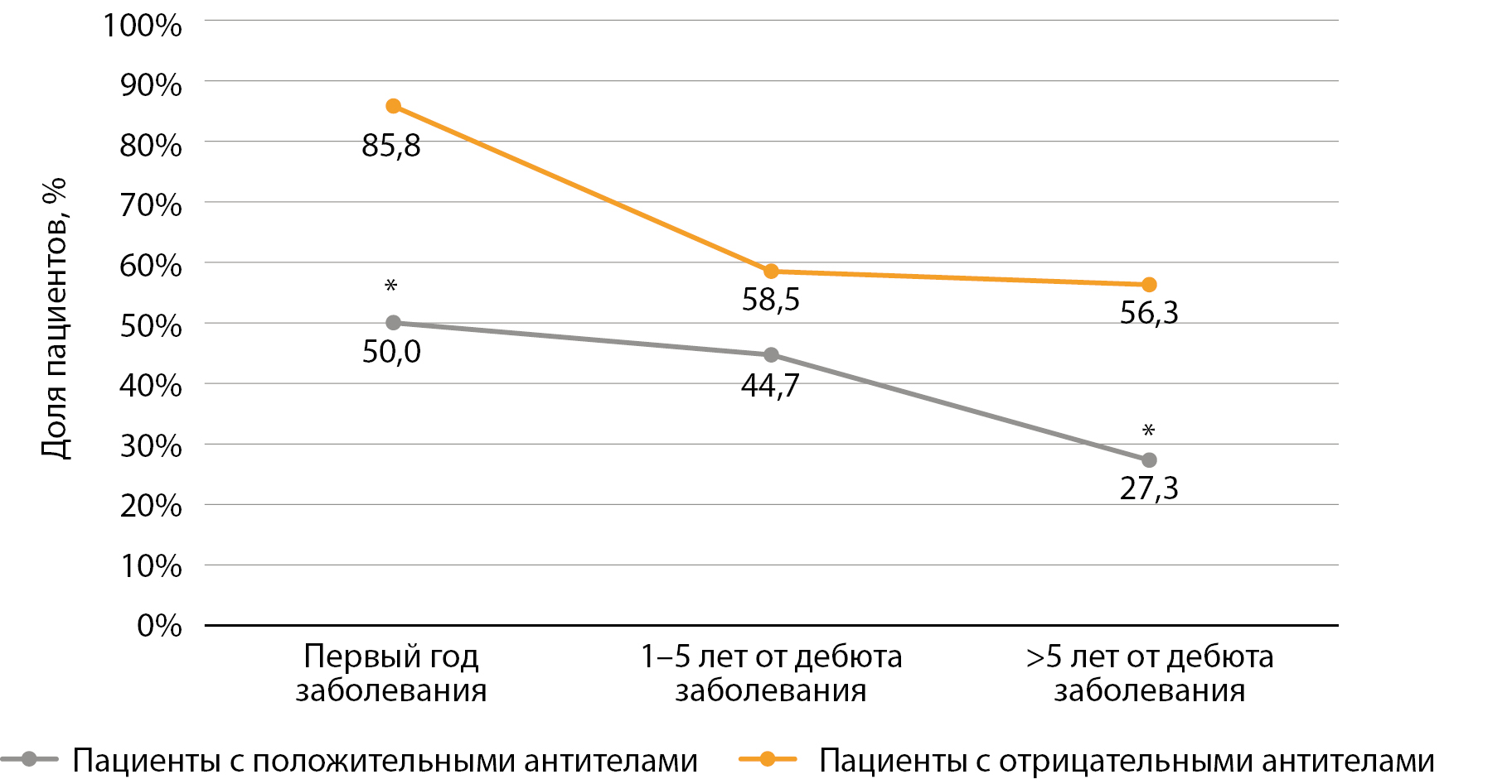 2. Рисунок 2. Доля пациентов с положительными и отрицательными антителами с сохранным уровнем базального С-пептида на разных сроках заболевания. | |