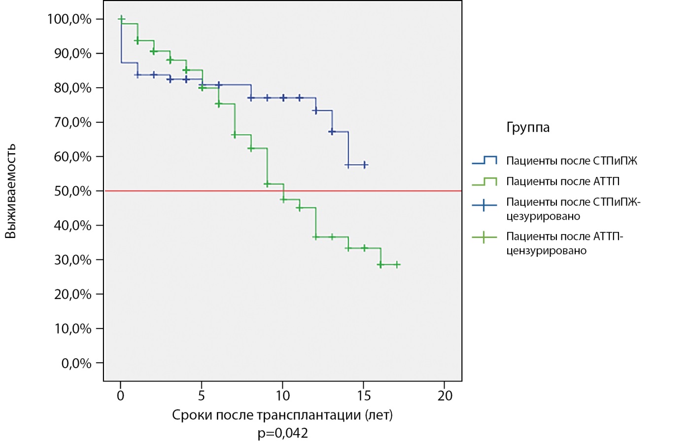 Рисунок 2. Выживаемость пациентов с сахарным диабетом 1 типа после трансплантации почки (выделено зеленым) и сочетанной трансплантации почки и поджелудочной железы (выделено синим цветом). Красной линией отмечен уровень полужизни реципиентов.